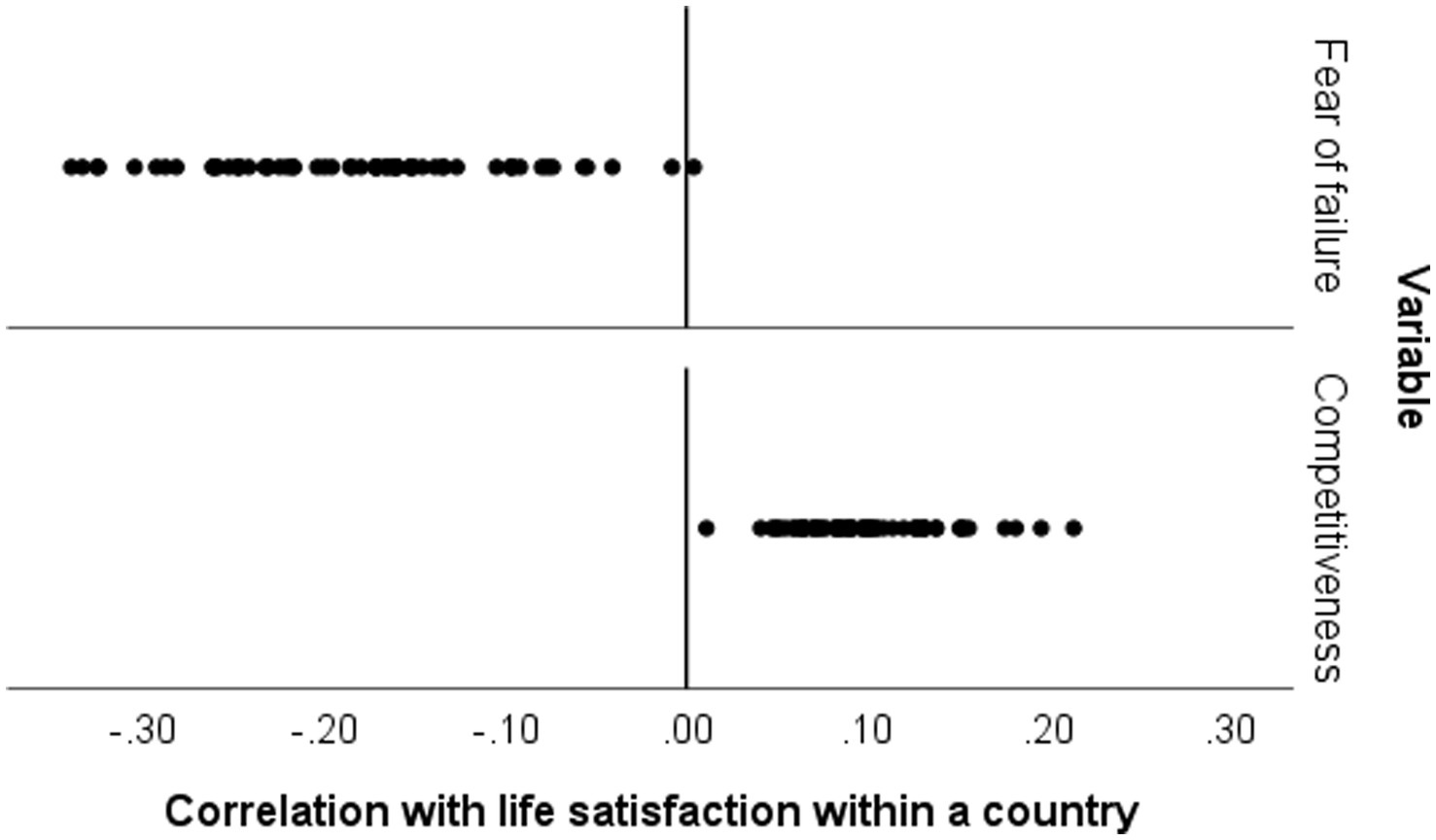 Consistent with prior research, life satisfaction is positively correlated with competitiveness in every country and negatively correlated with fear of failure in all countries but one, see Figure 3. (Note that these correlations have some sampling error, so the exceptional case may well be spurious).