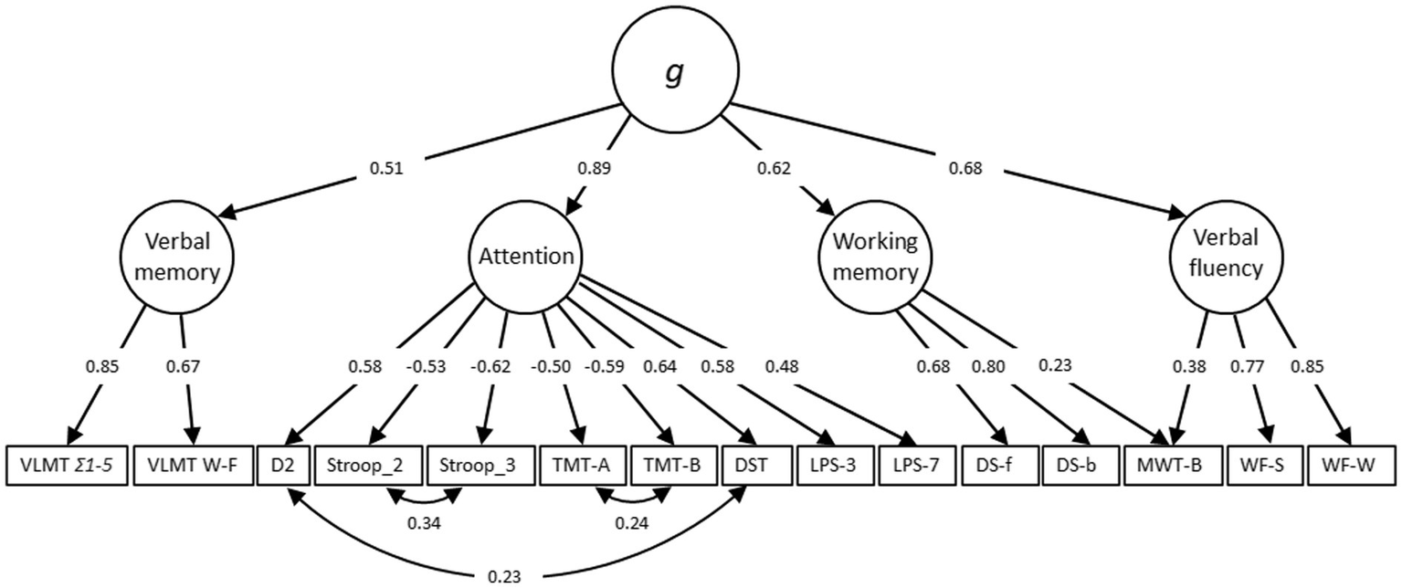 The outlined cognitive measures have been used to generate the g-factor also known as general intelligence. g-factor is a construct developed in psychometric studies of cognitive abilities and human intelligence. It is based on the observation that the performance of different cognitive tasks is positively correlated, reflecting the fact that an individual’s performance of one type of cognitive task tends to be comparable to that person’s performance of other cognitive tasks (Deary, 2020). The g-factor was assessed using structural equation modeling (SEM) with full information maximum likelihood (FIML), including the variables d2, DST, LPS 3, LPS 7, MWT-B, WF Spoken, WF Written, VLMT Ʃ 1–5, VLMT W-F, DS forward, DS backward, Stroop 2, Stroop 3, TMT-A, TMT-B. Individual regression analyses were calculated with age, sex, age2, age*sex, and age2*sex to extract the residuals. Then, the residuals were z-standardized (MW = 0, SD = 1). The result of the exploratory factor analysis indicated four factors: attention, verbal fluency, verbal memory and working memory, including the following tests: (a) Attention: d2, Stroop 2, Stroop 3, TMT-A, TMT-B, DST, LPS 3, LPS 7, (b) Verbal fluency: WF Spoken, WF Written, MWT-B, (c) Verbal memory: VLMT Ʃ 1–5, VLMT W-F, (d) Working memory: DS forward, DS backward.