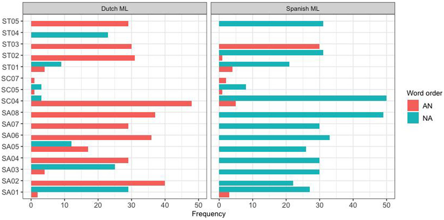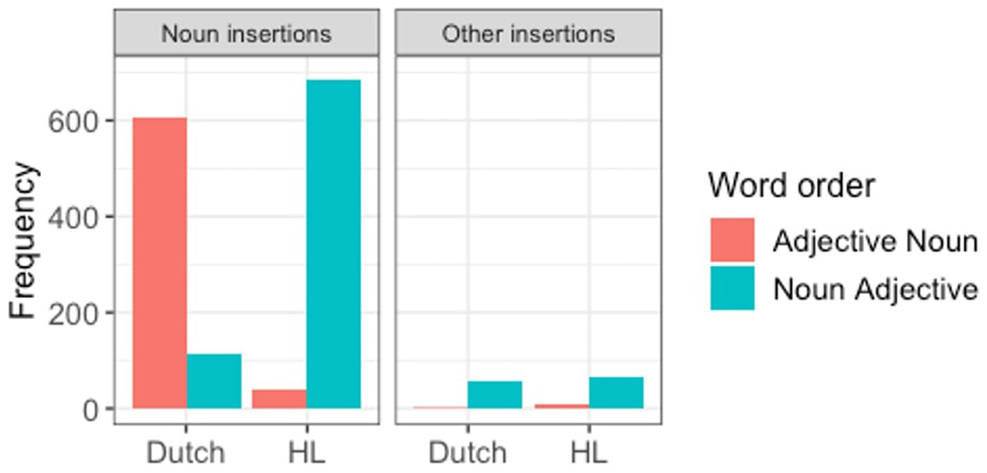 The results show that either the ML or the language of the adjective, or both, are important predictors for word order, although the data cannot disentangle these two factors. Moreover, the type of insertion was found to play a role: word order patterns for noun insertions differed from other types of insertions. In addition, the two groups did not behave similarly: Papiamento speakers were more categorical in their preference for noun-adjective order when inserting Dutch nouns into their heritage language than the Spanish speakers were. Finally, there was a great deal of individual variation, which seemed to be related mostly to the age of the participants: children and teen participants behaved differently from adults.
