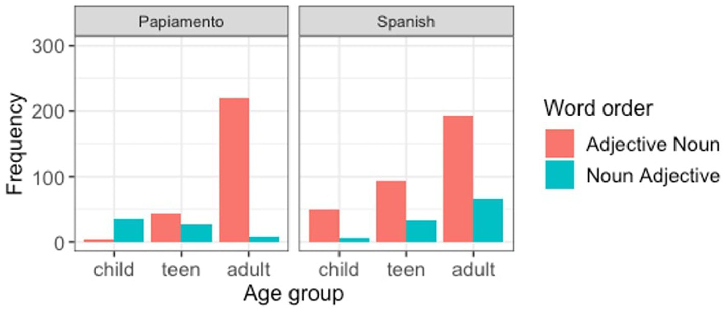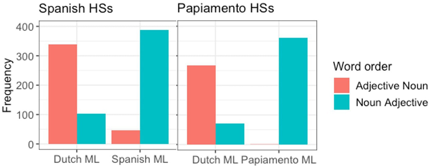 In this study, we look at two separate communities of heritage speakers who differ from each other in terms of age (comparing children, teens, and adults) as well as age of onset and patterns of use and exposure, in order to investigate which, if any, of these factors play a role in determining code-switching patterns. We focus on heritage speakers of Spanish and Papiamento who live in the Netherlands, targeting switching where the structures of the two languages differ (conflict sites, cf.Vaughan-Evans et al., 2020 for a recent overview). In particular, we address word order in adjective-noun switches. Adjectives are pre-nominal in Dutch and (mostly) post-nominal in Papiamento and Spanish (cf. section 2). Hence, Spanish-Dutch and Papiamento-Dutch code-switching between the noun and the adjective could result in four potential noun-adjective combinations (Pap/Span N Dutch Adj, Pap/Span Adj Dutch N, Dutch N Pap/Span Adj, and Dutch Adj Pap/Span N), so the question that arises is whether they are all possible or whether some combinations are disallowed in the bilingual grammars of these speakers. Due to the generally low occurrence of attributive adjectives in production data (cf.Parafita Couto and Gullberg, 2019), several studies attempted to unveil the constraints that predict code-switching patterns at this conflict site in different bilingual populations (Spanish-English, Welsh-English, and Papiamento-Dutch) using different methodologies (Parafita Couto et al., 2015, 2017a,b; Voss, 2018; Pablos et al., 2019; Stadthagen-González et al., 2019; Vaughan-Evans et al., 2020, i.a.). Most of these studies evaluated the predictions of two theoretical accounts: the Matrix Language Framework (MLF, Myers-Scotton, 1993) and the Minimalist Program approach (MP, Cantone and MacSwan, 2009), although no clear evidence to favor one model over the other was found. However, these studies provided valuable insight into a general preference for noun-insertions over adjective insertions (cf.Vaughan-Evans et al., 2020 for a detailed overview). In the next section, we present a brief description of Papiamentu–Dutch and Spanish-Dutch bilingualism and word order.
