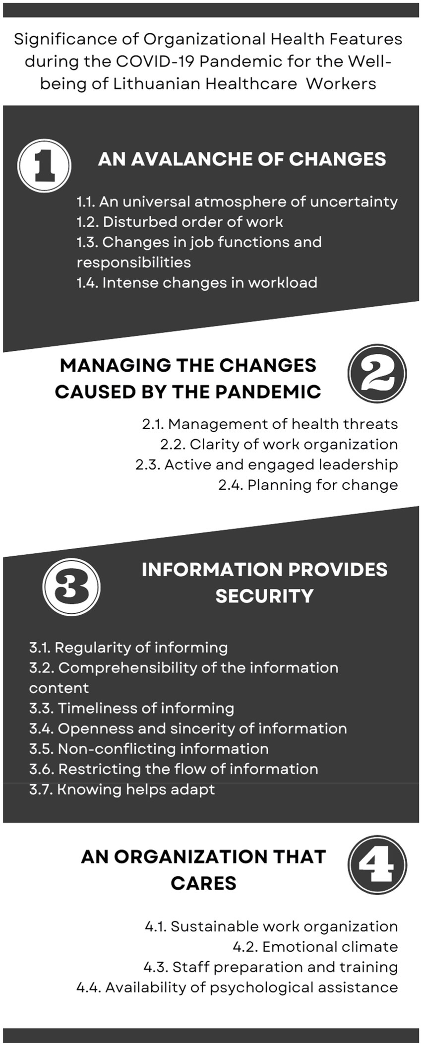 In this research, we used a qualitative approach to data collection and analysis that provides a deeper insight into the healthcare workers’ experiences at the beginning of the COVID-19 pandemic and the first quarantine wave to understand their daily lives, well-being, participation in the work environment and unplanned organizational changes during that time. Our research broadens the understanding of pandemic management factors relevant at the organizational level and their potential interaction in the event of a pandemic. We identified 4 qualitative themes and mapped them, highlighting the most important organizational factors that emerged during the research.