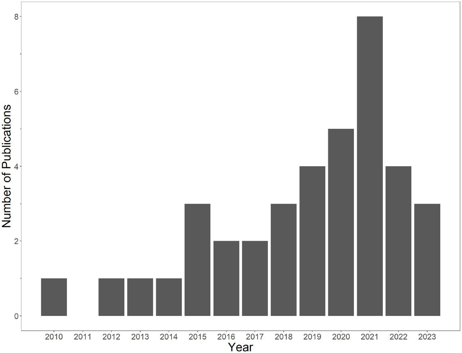 Figure 2 illustrates that all papers identified for inclusion were published in 2010 or later, with the number increasing over time. The earliest article included, from 2010, was a dissertation (Chadwick, 2010). The earliest article included that was published in a peer-reviewed journal was in 2012 (Ojala, 2012a). There were eight papers included from 2021 (the last complete year of the systematic literature review).