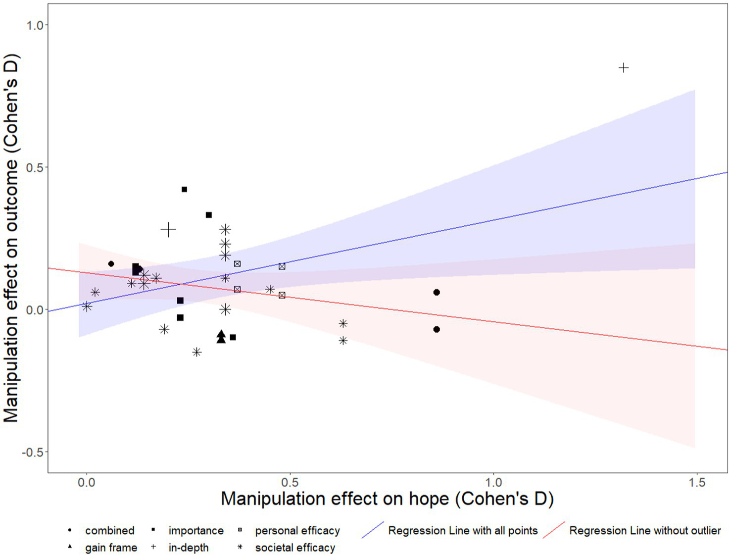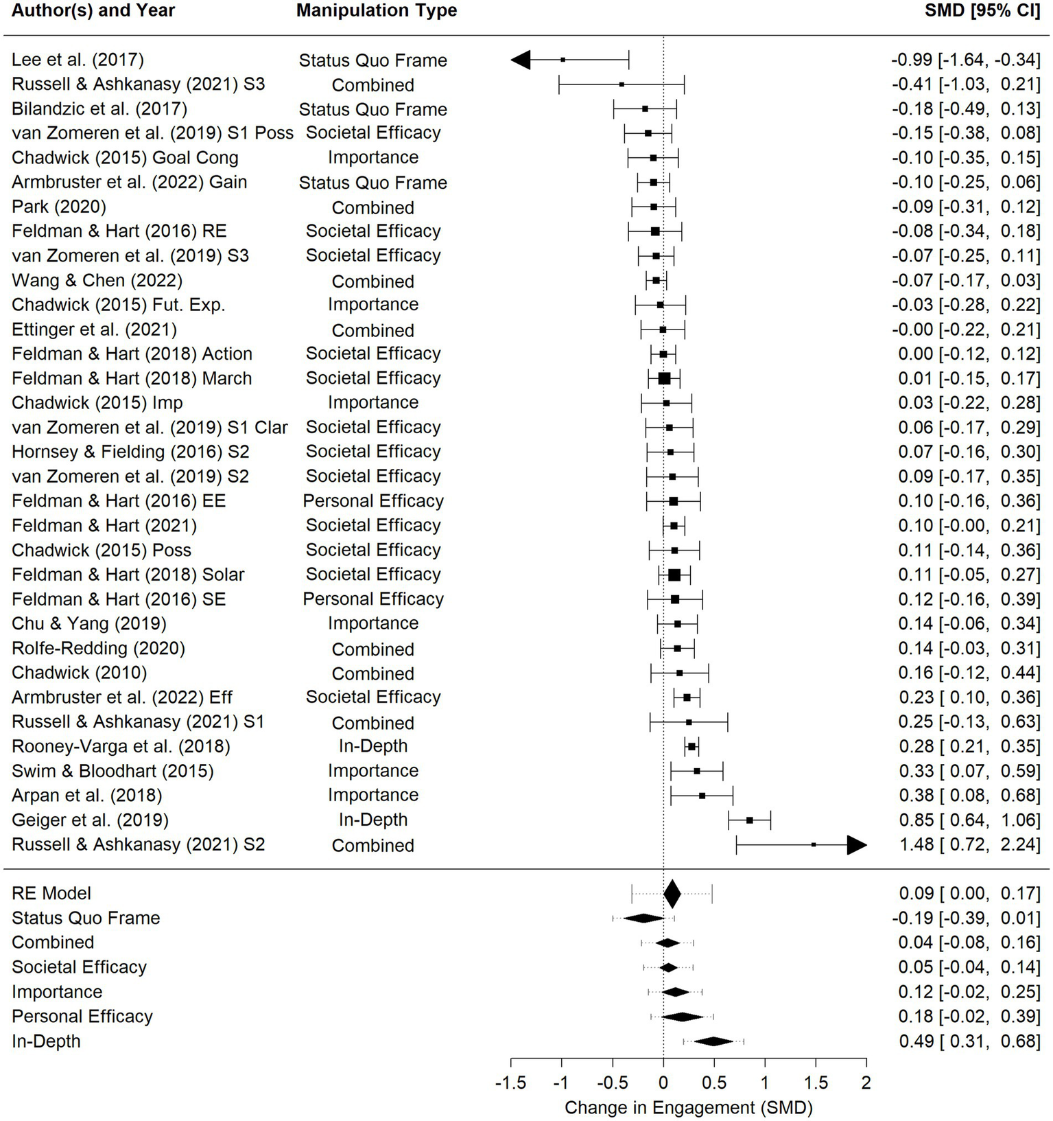 Table 2 lists journals with multiple articles published that were included in the present meta-analysis. As can be seen from the table, many articles came from a journal where they were the only eligible article from that journal, and a few journals had published several articles that were included in the present meta-analysis. Of the journals with multiple articles, many were interdisciplinary (e.g., Climatic Change, Global Environmental Change, Sustainability, and Risk Analysis), and other journals represented environmental education (Environmental Education Research), psychology (Journal of Environmental Psychology), and communication (Science Communication). Notably, given the topic, Environmental Communication had not published many articles included in this meta-analysis: they had published a single early article on the topic (Swim and Bloodhart, 2015) but no other articles since. Examining the table also reveals that most journals that had published multiple articles had at least some articles with studies involving manipulations of hope. The one exception was Environmental Education Research, which had published five articles involving only cross-sectional correlational data (many of these papers also included other information not included in the present meta-analysis, such as qualitative data).