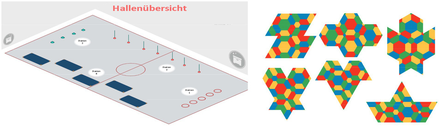 For the physical task area, an obstacle course (as shown in Figure 5) with four different movement challenges was chosen. Each challenge contained a physical component (basic movements such as jumping, running, and/or a combination) and a cognitive part (e.g., movement reaction to certain colors). In relation to the cognitive section of the lesson, the task “Tagram” from the script “PUSE Methodology Poly-Universe in school education” by Saxon and Stettner (2019) was used. “Tagram” is about reconstructing given shapes with connections of the same size and color by using the PolyUni triangle set.