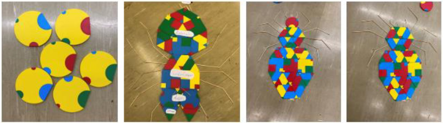After photo analysis, the findings show that groups 1, 4, and 5 used color, size, and (geometric) shape combinations as codes to correctly display the biological content and to solve the different tasks. In Figure 6 groups 1 and 5’s solutions are presented. Group 1 used the same sizes, the same-sized semicircles pointing in the same direction, same shapes (circles) and color (yellow) to represent the eggs of a cockchafer. Same size, color, and shape codes are also used in group 5’s solution. Two green triangles of equal size are used for the spider’s jaw claws and circles for the eyes. As seen on the prosoma two of the same size semi-squares are connected vertically with each other. Group 2 used shape combinations as codes “far beyond the essentials” and the size combination utilization was “fully met in the essential areas.” Only group number 3 hardly used geometric shape codes, and furthermore, no color and size codes. Concerning the debugging, at least all groups “fully met in the essential areas.” From the observer’s point of view, all students found mistakes and improved them on their own, recognized patterns and codes from the other groups, and further incorporated them into their own codes to improve their solutions, especially in groups 1, 4, and 5. As seen in Figure 6, group 4’s first approach was that Araneae have a caput, a thorax, and an abdomen, i.e., a body structure like an insect. After comparison with the other groups, their first approach was improved, and the final solution showed the prosoma and the opisthosoma.