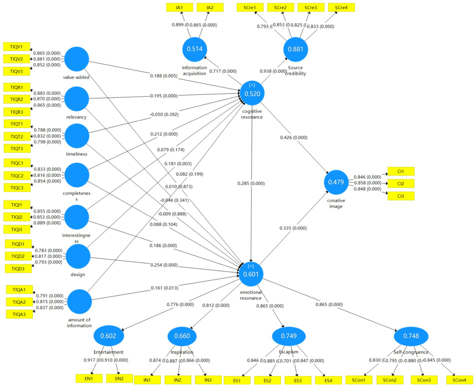 The measurable items of seven factors (amount of information, completeness, design, interestingness, relevancy, timeliness, and value-added) of OTIQ used in this study are inspired by Kim et al. (2017). The measurable items of cognitive resonance and affective resonance are borrowed from Cheng et al. (2020). The measurable items of the conative image are borrowed from Afshardoost and Eshaghi (2020). All the measurement scales have been well-validated in previous studies. To suit the research setting, an expert meeting was conducted to slightly adjust the original measures according to the content of this case. The panel of experts includes two scholars in tourism, a social media company executive, a member of the tourism board, and three tourists who have used social media for planning travel. Experts recommended some modifications such as removing two items referring to video quality and no specific location in measuring conative image.