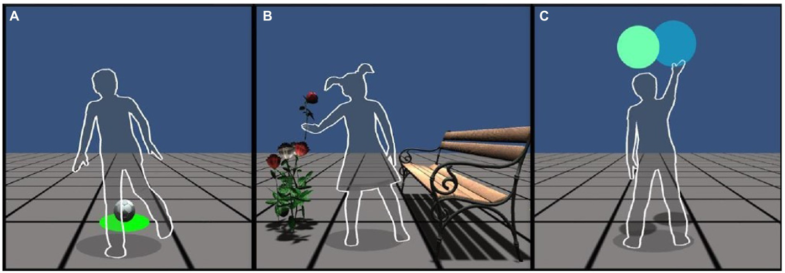 Screen captures of the interactive virtual tasks: (A) KT; (B) FT; (C) BT. Participants could choose to interact through the male or female human shape.