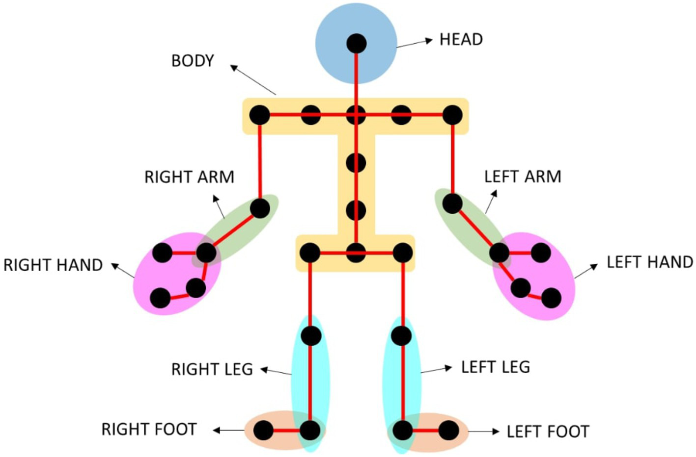 Body joints tracked by the Azure Kinect DK (black dots on the skeleton) and joint groups created (circled in different colors).