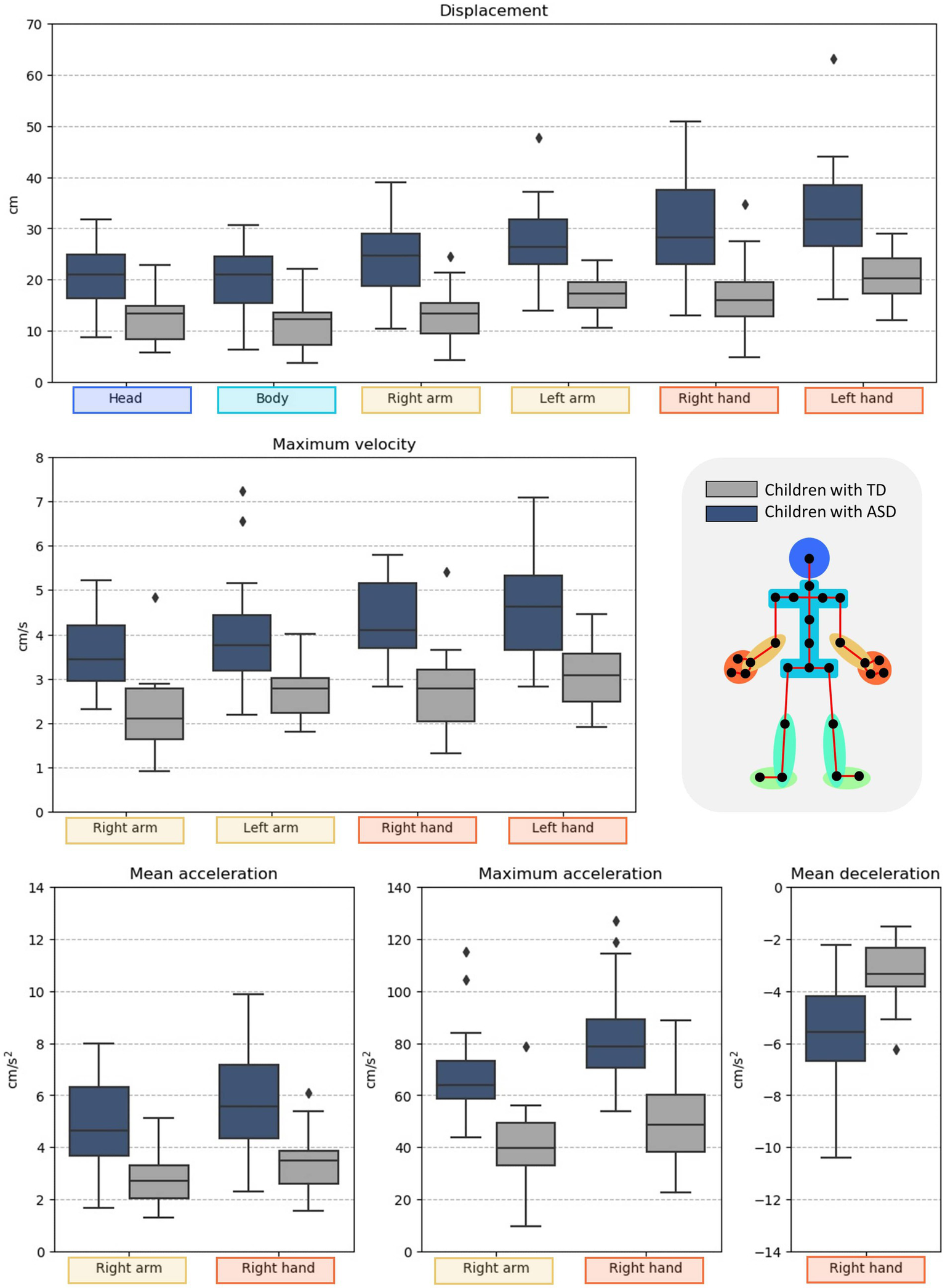 | Mean acceleration | Right arm | ASD: 4.865 (1.723) TD: 2.827 (1.04) | t(36) = −4.23 | 0.0002 | 1.41 |