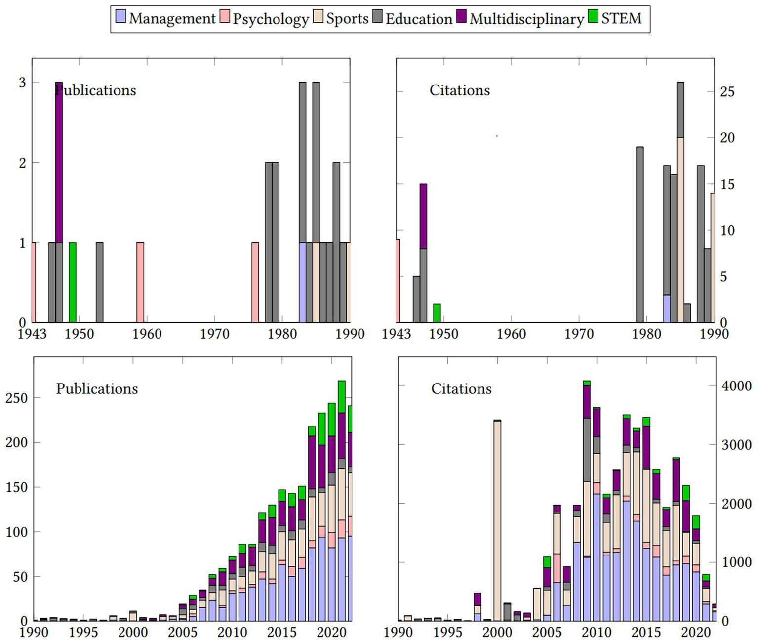 The research in TI has maintained consistent growth over the past 80 years. The average year growth for research publication in TI across multiple areas was 7.19%. The number of publications and citations demonstrates the increasing interest in TI from multiple fields. Figure 2 presents the total production and citation growth in TI research including growth patterns disaggregated by research field according to the Scimagojr classification. The growth in TI research was slow during the second half of the 20th century. In our data, only 62 (2.4%) articles were published between 1943 and 2000, corresponding to the fields of education, psychology, management, and sports. The fields of sports science and management showed an explosive growth pattern since the year 2000. All fields display a sharp upsurge of publications after 2000, which can be attributed to increased online publications and internet access. On average, the field with the most publications per year post 2000 was management (M = 37.87, SD = 33.9), followed by sports (M = 21.5, SD = 18.22) and multidisciplinary research (M = 20.4, SD = 17.6). Fields of education, psychology, and STEM produced, on average, fewer than ten articles per year according to Scopus and WOS databases. Two systematic reviews published in 2000 by Reilly and colleagues in the Journal of Sport Sciences caused the abrupt spike of citations in the field of sports.