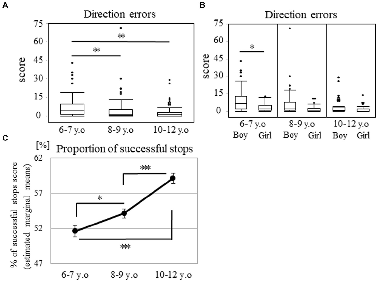 The participants were divided into three groups according to age, such as 6–7, 8–9, and 10–12 years. Because of larger inter-individual differences, especially among younger children, and the custom of dividing 6 years of elementary school into low, middle, and high grades from qualitative changes in the learning curriculum, which requires increased levels of abstract thinking, we divided our sample into three age groups on a two-year basis. In the SST subtest, the participants who showed noncompliance with the instructions or were characterized by more than two SD of the mean reaction time on the go trials when the correct button was pressed were excluded from this analysis.