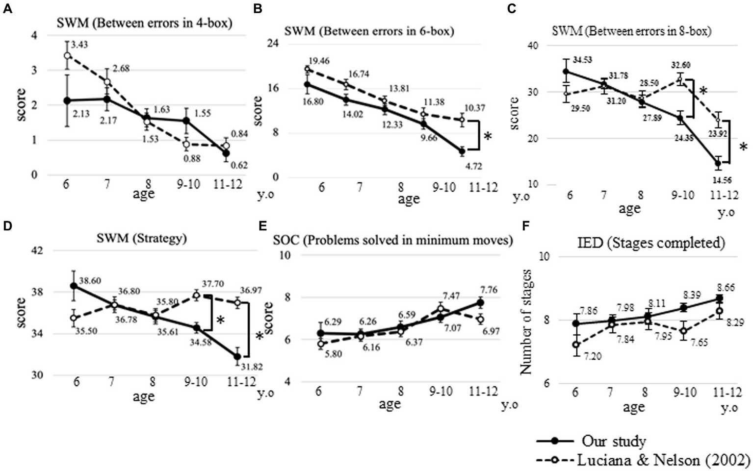 Additionally, in the preliminary investigation examining the differences between the outcomes of this study’s sample and that of the previous study, we first adjusted our data to correspond to the age range shown in the previous study, such as six, seven, eight, 9–10, and 11–12 years (Luciana and Nelson, 2002). We used the summary independent-samples Welch’s t-test for the outcome measures common in both studies, which are as follows: between errors in the four-, six-, and eight-box problems and strategy scores in the SWM, the problems solved using the minimum possible moves in the SOC, and the stages completed in the IED. The level of significance was manually corrected and set at p < 0.01 to allow for the application of Bonferroni’s correction.