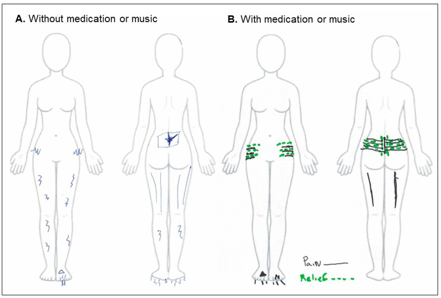 Location of pain when she has not used medication (A) and when she took medication or listened to music (B). When there were no periods of medication, the pain was felt in the back of the legs, which was sciatica, and nerve pain in the legs and under the feet. When she took medication or listened to music, she felt pain in her lower spine and feet, where she also felt relief.