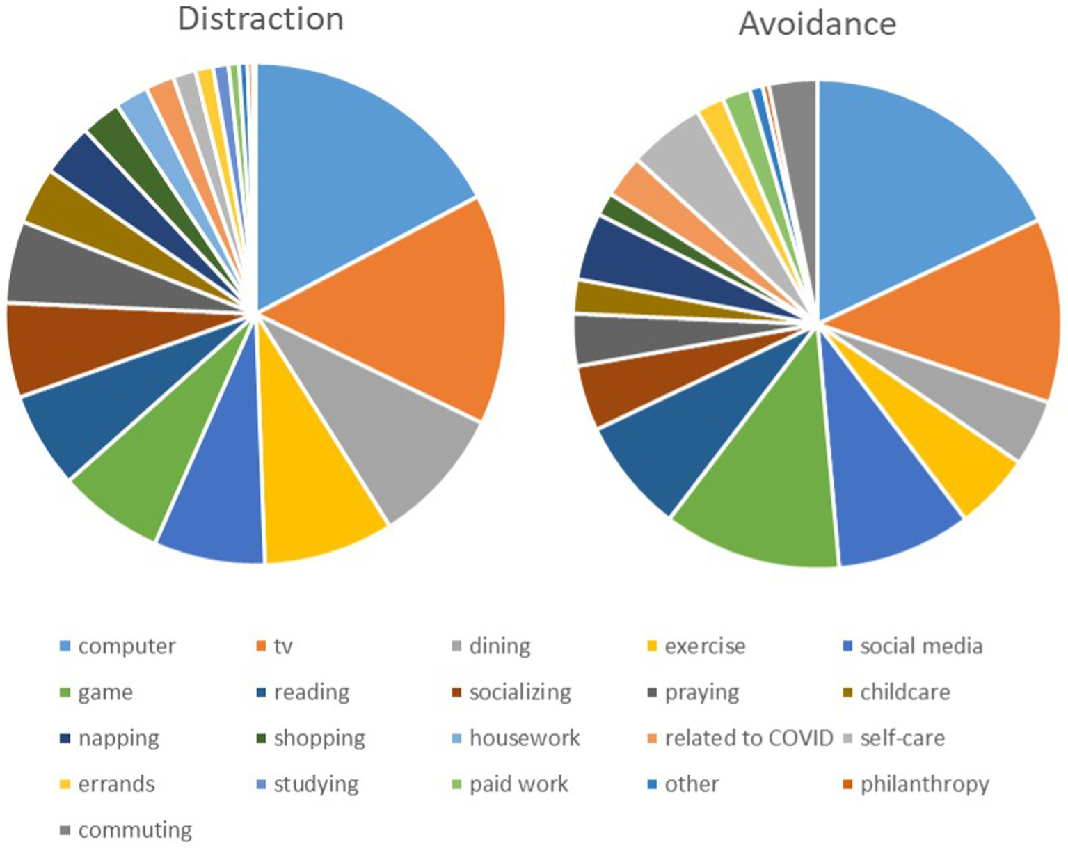 On average, people distracted themselves on 14.7% of their episodes and used avoidance on 6.5%. Participants distracted themselves the most by using the computer, watching TV, dining, exercising, and using social media (Figure 1). Participants avoided thinking about the COVID-19 pandemic the most by using the computer, watching TV, playing a game, using social media, and reading (Figure 1).