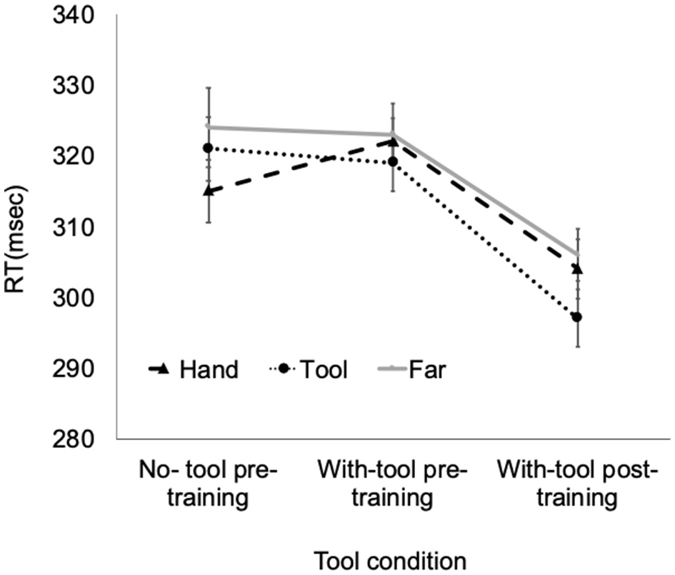 A repeated-measures ANOVA was performed for RT with-tool condition (3: no tool–pre-training, with tool–pre-training, and with tool–post training) x target position (3: near hand, near tool, and far). Before the ANOVA, we confirmed the sphericity assumption of data by Mauchly's test and the normality of the data by Kolmogorov–Smirnov test. There was a main effect of tool condition, F(2,50) = 14.69, p < 0.001, = 0.37 and target position, F(2,50) = 3.57, p = 0.036, 0.12. In addition, there was an interaction in tool condition x target position, F(4,100) = 4.58, p = 0.002, = 0.15. A one-way ANOVA for RT by target position was performed in each tool condition. There was a significant main effect of target position in the no tool–pre training condition and with tool–post-training condition. In the no tool–pre-training condition, the RT of the near-hand condition (mean = 315 msec, SD = 39 msec) was significantly shorter than the near-tool (mean = 321 msec, SD = 43 msec) and far conditions (mean = 324 msec, SD = 47 msec), near hand–near tool: p = 0.043, near hand–far: p = 0.009. This near-hand advantage was reversed in the with tool–post-training condition, near hand (mean = 304 msec, SD = 37 msec)–near tool (mean = 297 msec, SD = 37 msec): p = 0.007; near tool–far (mean = 306 msec, SD = 38 msec): p = 0.005. There was no significant main effect of target position in the with tool–pre-training condition, F(2,50) = 14.69, p < 0.001, = 0.37 (near hand: mean = 322 msec, SD = 47 msec; near tool: mean = 319 msec, SD = 42 msec; far: mean = 323 msec, SD = 44 msec) (see Figure 4).