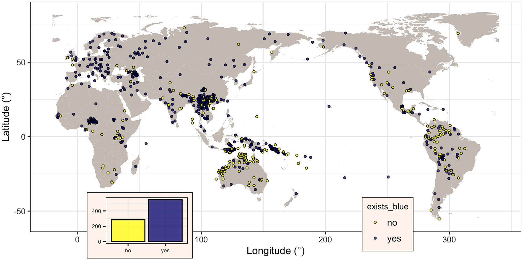 The binary variable blue, coding the presence (“yes”) or not (“no”) of a dedicated word for “blue” in a given language, was coded for all the 834 languages, of which 549 (65.8%) do have such a word (i.e., blue is “yes”) and the remaining 285 (34.2%) do not. Visually (Figure 1), their distribution seems to be spatially non-random, with the majority of languages without a word for “blue” seemingly clustered closer to the equator. However, this impression can be misleading due to various confounding factors (Ladd et al., 2015), paramount being “Galton's problem” (Mace and Holden, 2005) and language contact. The first refers to the fact that related languages (i.e., languages from the same family) are not independent, as they may inherit some of their characteristics from the family's proto-language, while the second refers to the fact that languages in contact may come to share characteristics as well.