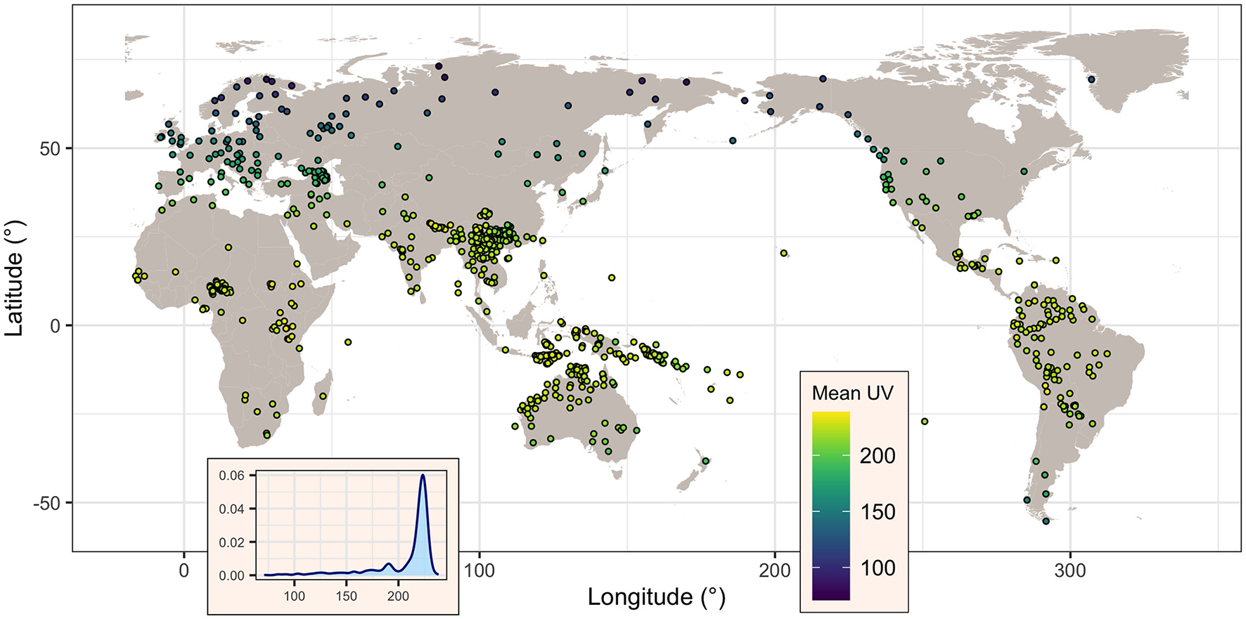 Map of the languages showing, for each, its mean UV-B incidence (as given by TOMS, in mW/m2), as well the overall distribution of this variable across all languages (inset). Figure generated using R version 4.2.3 (2023-03-15) and packages ggplot2 (version 3.4.1) and maps (version 3.4.1), using public domain data from the Natural Earth project as provided by the R package maps.