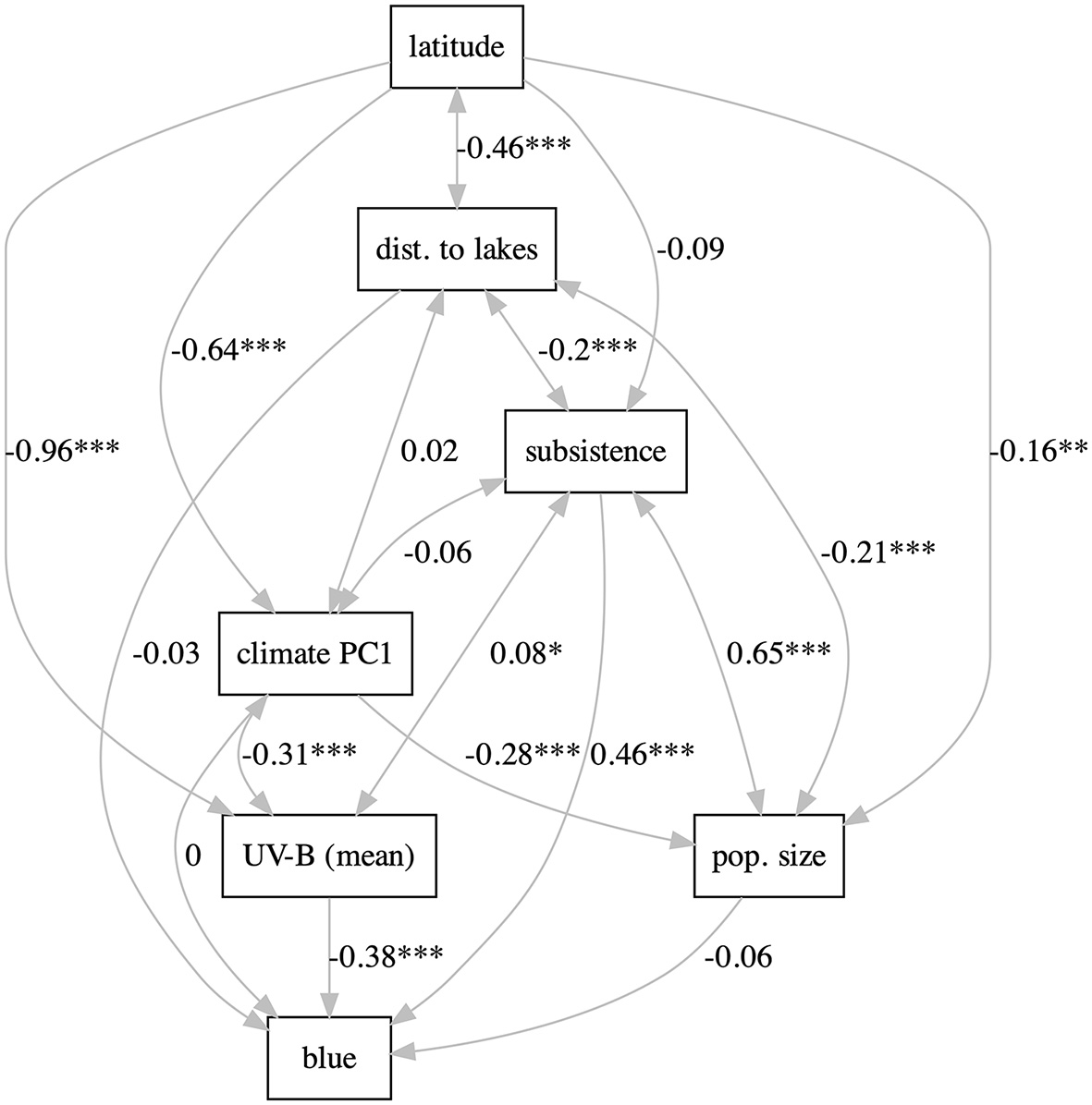 Third, path analysis (Wright, 1934) models were fitted using lavaan (Rosseel, 2012), which model those relationships that are theoretically important (see Josserand et al., 2021 for details) to the primary hypothesis. While this method allows the simultaneous modeling of multiple influences (paths) between several variables (which the mediation approach does not), it cannot (at the moment) control for the effects of family and macroarea (as the mediation models do); moreover, this was fitted in a frequentist framework. To address some of these limitations, path analysis was also conducted in a piecewise Structural Equation Models framework where the individual regressions composing the model are fitted simultaneously either in a frequentist (using piecewiseSEM) or Bayesian (using brms) approach, which allow the inclusion of family and macroareas as random effects and the use of generalized linear models (in particular, of logistic regression; N.B., piecewiseSEM does currently have some limitations that might affect the use of dichotomous variables). However, it can be argued that some of the predictors are, in fact, indirect measurements of the unmeasured latent variables that presumably play the causal role, in particular UV-B incidence (captured by its mean and standard deviation), “cultural complexity” (partly captured by subsistence and population size), and possibly climate (captured by various climate PCs and humidity). Therefore, Structural Equation Models with latent variables were also implemented using lavaan with the aforementioned limitations, with the partial exception of also conducting a multi-group analysis using macroarea as a grouping factor, which allows the estimation of separate parameters for each macroarea.