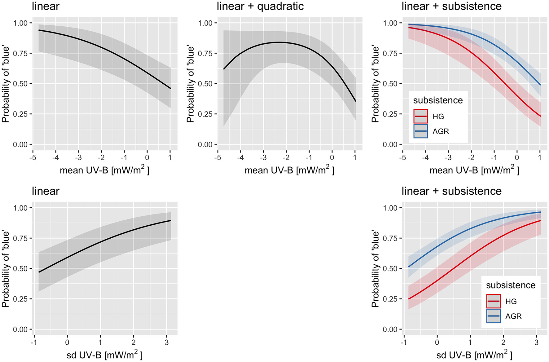 The standard deviation of the UV-B incidence (UVsT) varies between a minimum of 1.1 mW/m2 and a maximum of 71.2 mW/m2, with a mean of 16.4 mW/m2 and a median of 7.6 mW/m2, and a standard deviation of 17.5 mW/m2 and an IQR of 12.9 mW/m2. As can be seen in Supplementary Figure 2, UVsT is sharply skewed toward low values, essentially because most languages in the dataset have a low seasonal variation in UV-B incidence.