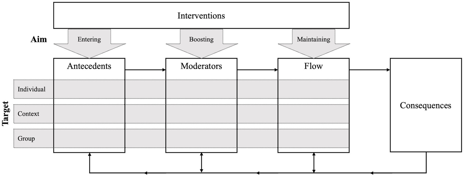 We attribute the hesitance of the empirical field to address this line of research to three main reasons. First, the empirical field is still debating a common conceptualization of flow (Peifer et al., 2022), especially with regard to its operationalization as continuous or discrete (Abuhamdeh, 2020). However, agreement on how to measure flow in different settings is necessary for the evaluation of intervention effectiveness. Second, flow states at work are highly variable within- and between-persons (Fullagar and Kelloway, 2009; Ceja and Navarro, 2011). Moreover, individual characteristics as well as task type determine the overall likelihood of experiencing flow (Nielsen and Cleal, 2010; Tse et al., 2021), thereby making it difficult to find an intervention that is effective across individuals and jobs. Reducing this complexity in designing flow interventions requires breaking down the end goal into less complex subgoals, thereby providing an anchor for where to start. In fact, Nakamura and Csikszentmihalyi (2012) have already suggested two approaches to fostering flow: targeting the environment or the individual. Both are valuable strategies because flow arises when there is a fit between situational and individual characteristics (Peifer and Wolters, 2021). However, a framework that integrates different goals of interventions with respect to the individual flow state (currently being in flow or not) as well as to distinct environmental or individual targets is still missing. This lack of a framework further impedes the systematic development and evaluation of suitable interventions.