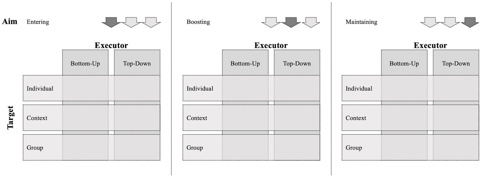 In sum, we believe that it is important to investigate both bottom-up and top-down interventions because this empowers individuals and organizations alike. As described above, both types of executors can apply interventions with regard to each aim and target, i.e., across the other two dimensions of our framework.