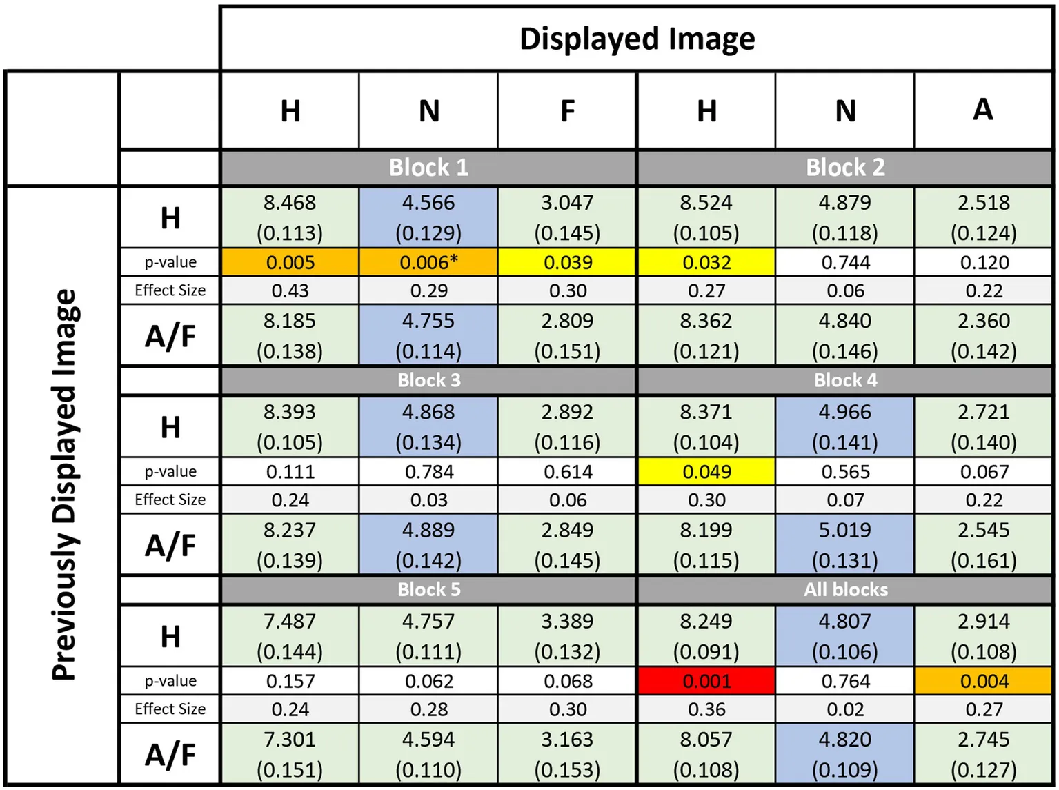 Table 1 display the mean participant ratings across blocks and primer-target conditions. While not always statistically significant, positive affective priming effects (indicated by green shading) were observed in all blocks when the prime and target had the same valence (either positive or negative). However, surprisingly, this effect was not present when the target was neutral. In fact, in some cases, affective priming effects were absent (blocks 2, 3, and 4) or even significantly negative (block 1) when the target was neutral.
