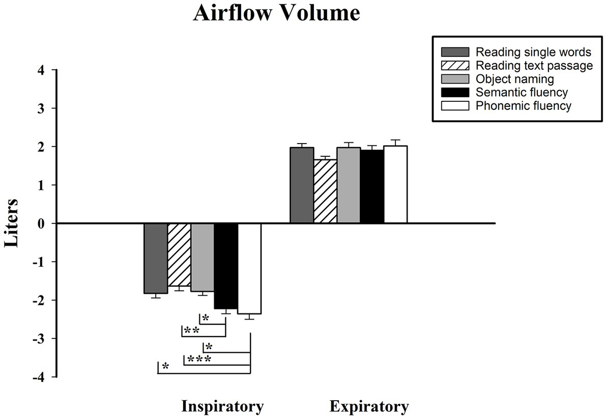 In this respiratory measurement (see Figure 5), pairwise statistics showed that during the inspiratory phase, significant differences were present between the VFTs and the other tests. The inspiratory volume for semantic VFT was significantly greater than during reading a text passage task (Mdiff = −0.59, p < 0.01), as well as in the object naming task (Mdiff = −0.45, p < 0.05). As for phonemic VFT, differences in the inspiratory volume were found against reading single words (Mdiff = −0.53, p < 0.05), reading a text passage task (Mdiff = −0.72, p < 0.001), and the object naming task (Mdiff = −0.58, p < 0.05). Thus, both VFTs required a greater volume of inspiration than the other verbal tasks. Concerning the results of expiratory volume, no significant differences were found across the five tasks.