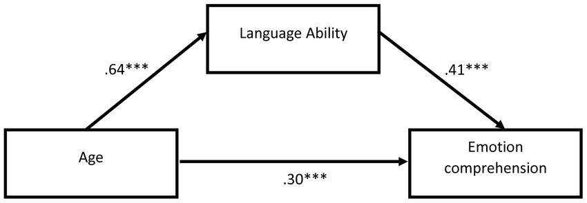 In terms of the role of language, which significantly predicted children’s understanding of the opacity of mental states, we examined whether or not language ability is a mediator between age (in months) and the ability to understand emotions, through a mediation analysis using the PROCESS v.4.1 macro (Model 4; Hayes, 2013). A regression model with 20,000 bootstraps and a 95% confidence interval was used to estimate the effects. Age significantly predicted the level of linguistic ability (b = 1.03, p < 0.001, 95% CI [0.79–1.27]), which was positively related to the ability to understand emotions (b = 0.03, p < 0.001, 95% CI [0.21–0.47]). There was also a statistically significant mediating effect between age expressed in months and the ability to understand emotions by language ability (b = 0.03, 95% CI [0.02–0.05]). When the mediator was included, the direct effect between age and language ability was reduced from b = 0.07, p < 0.001, 95% CI [0.05–0.09] to b = 0.03, p = 0.003, 95% CI [0.01–0.05]. This model explains 48% of the variance (see Table 4 and Figures 1, 2).