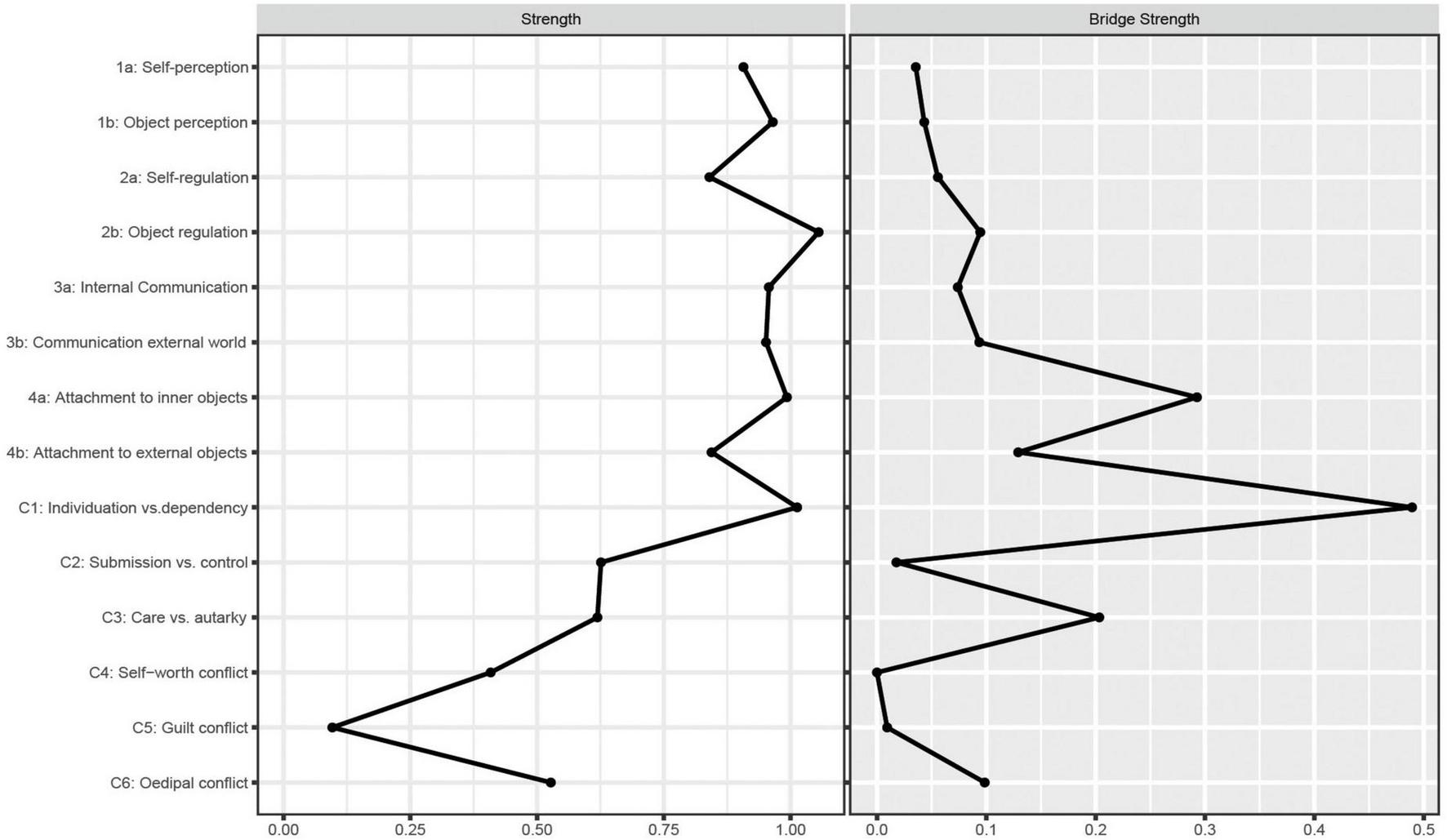 We additionally identified bridge nodes using the bridge function of the R package networktools v.1.5.0 (Jones, 2022). Bridge nodes are defined as the nodes that are linking two communities (here: psychodynamic conflicts and structural dimensions). We inspected bridge strength centrality, which reflects the sum of all absolute edge weights connecting a node from one community to all nodes from the other community (Jones et al., 2019).