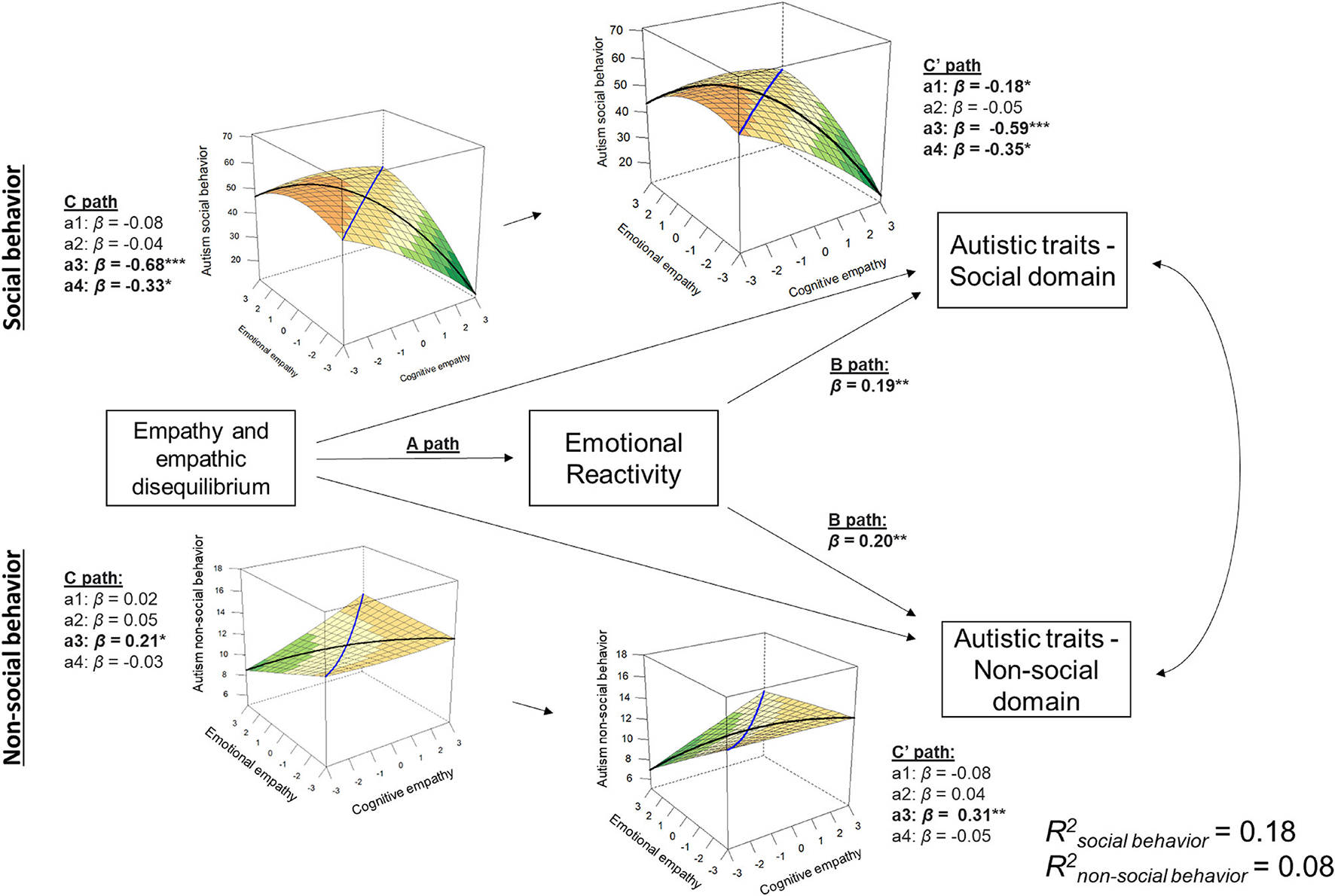In line with our hypotheses, parameters of the PRRSA were used to examine both equilibrium (blue line in Figure 1) and disequilibrium (black line in Figure 1) between CE and EE and their relationships with each outcome. These two lines are described by four parameters derived from the equation above estimating the linear (a1) and non-linear (a2) association of overall empathy and the outcome; and the linear (a3) and non-linear (a4) association of empathic disequilibrium with the outcomes. Sex and age were controlled for as covariates. All analyses were also conducted using traditional difference score analyses, which entirely replicated all results (see Supplementary Text).