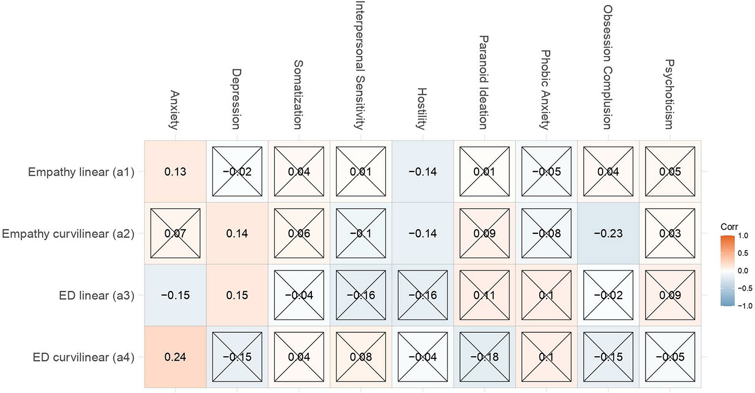 In this section, we adopted a more exploratory approach. To make sure our findings are robust and replicate we randomly split the dataset into two. The first dataset (30% of the data, N = 123) was used to identify the specific dimensions of psychopathology related to empathic disequilibrium. The BSI subscales are highly correlated (see correlation matrix in Supplementary Figure S2), reflecting, in part, general distress levels (Piersma et al., 1994). Therefore, to gain better understanding of the unique dimensions predicted by empathic disequilibrium, each subscale was examined after partialing out all other subscales of the BSI. In the second dataset (70% of the data, N = 285), only dimensions that were significantly related to empathic disequilibrium (either linearly or non-linearly) in the first dataset were further examined in the mediation analyses. It should be noted that such approach (partialing-out large proportion of the variance in each BSI scale as well as reducing our sample size), might result in a Type II error (Lavery et al., 2019). However, such a design ensures an independent replication of any association signals detected.