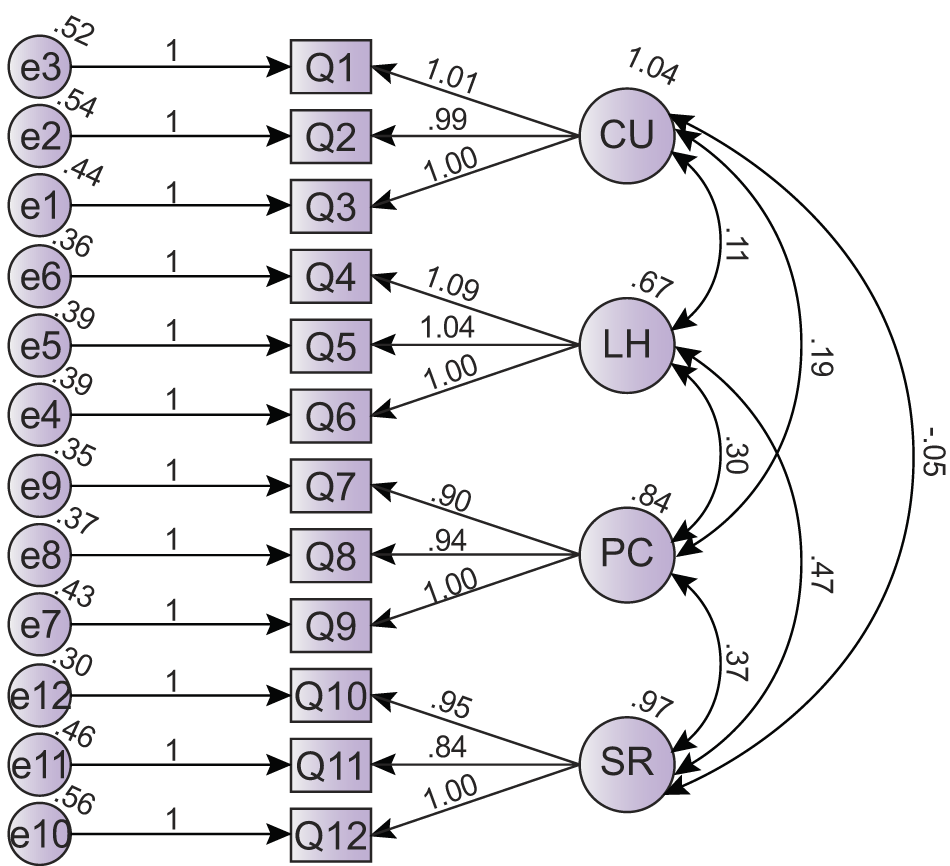 The four-factor ESE model showed the best fit; thus, the four-factor ESE structure was retained. The AVE (average variance extracted) was CU = 0.775, LH = 0.705, PC = 0.734, and SR = 0.702 (that are comfortably higher than the critical value of 0.50), suggesting good convergence of the scale (Izogo, 2016). With the extensive analysis done here and additional comparisons made to the literature, the four-factor model for ESE scale developed is established as a reliable and valid measurement tool. When the findings of the research and those in the literature are compared, the four-factor structure of the experimental self-efficacy scale is verified, and a reliable and valid measurement tool is developed. Similar to Kolil et al. (2020), where the authors reported the Kaiser-Mayer-Olkin (KMO) value as 0.80 for the ESE-scale, the current study was also able to reproduce the acceptable KMO measure of sample adequacy (KMO = 0.819).