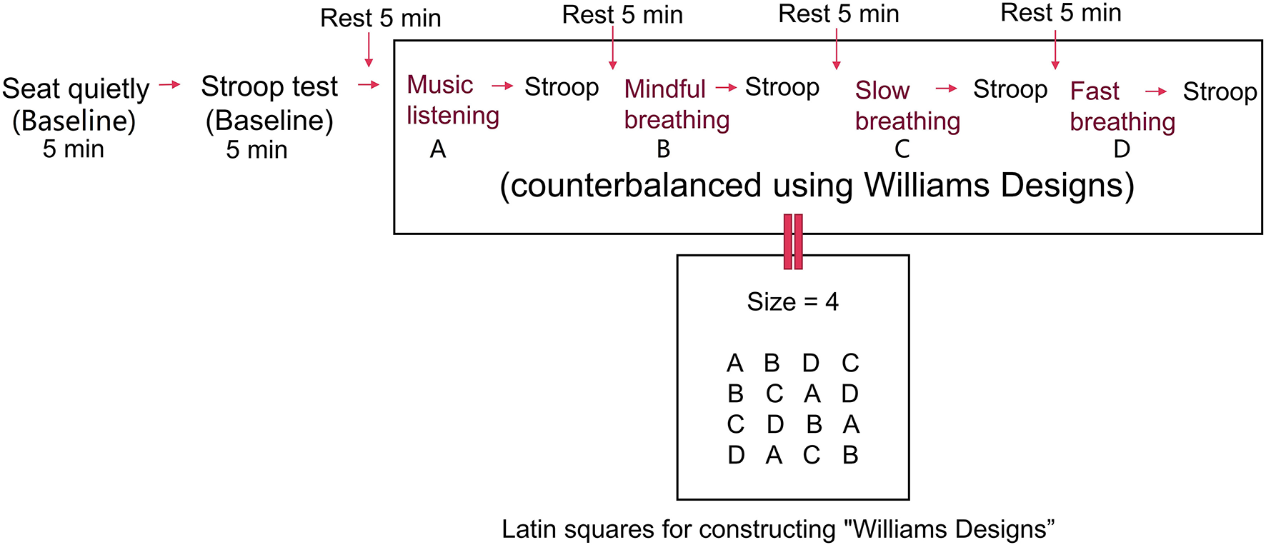 The same participants were tested in all conditions to limit inter-individual differences and minimize random noise (Laborde et al., 2017). The duration of the interventions, the Stroop test, and the rest between interventions were set at 5 min according to the previous studies (Endo et al., 2013; Beng et al., 2016; Kluger and Gross, 2020). To ensure that the participants could perform breathing exercises properly, they received one-time online training 1 month before the testing day and were requested to practice for 1 month. All participants were invited to a social platform group where they could ask questions and exchange training videos, and instructors checked and guided participants' movement of SLOW during the 1-month training period through video recordings and/or online meetings. Prior to the experiment, participants underwent two training sessions on the Stroop test to reduce the learning effect. Then, participants sat on an adjustable chair in a standardized posture, with ~90 degrees flexion of the knees and hips, and a straight upper body (Figure 1); the computer screen was set at 50–80 cm in front of the face. The angle between the arm and the trunk was about 20 degrees, and the angle between the forearm and the arm was about 110 degrees, the junction of the front one-third of the forearm and the back two-thirds (the tester made marks on participants' arms) was above the edge of the table. Two markers were put on the table beside the participants' forearms to eliminate the movement. During the experiment, participants performed a one-time baseline test (watching a neutral video for 5 min) and then completed 5 min of MUSIC, MINDFUL, SLOW, and FAST in a random sequence. The Stroop test was performed after each intervention, including the baseline test, and was followed by a 5 min rest before performing the next intervention. While watching the video, listening to music, and performing breathing methods, participants overlapped their hands and rested the ulnar side on the table with palms toward the body and eyes closed. Before the Stroop test, participants opened their eyes and waited for 10 s to “wake up.” At the resting time, participants were allowed to stand up, walk, and drink water. Sequence randomization used the Latin Square Williams design, as shown in Figure 2.