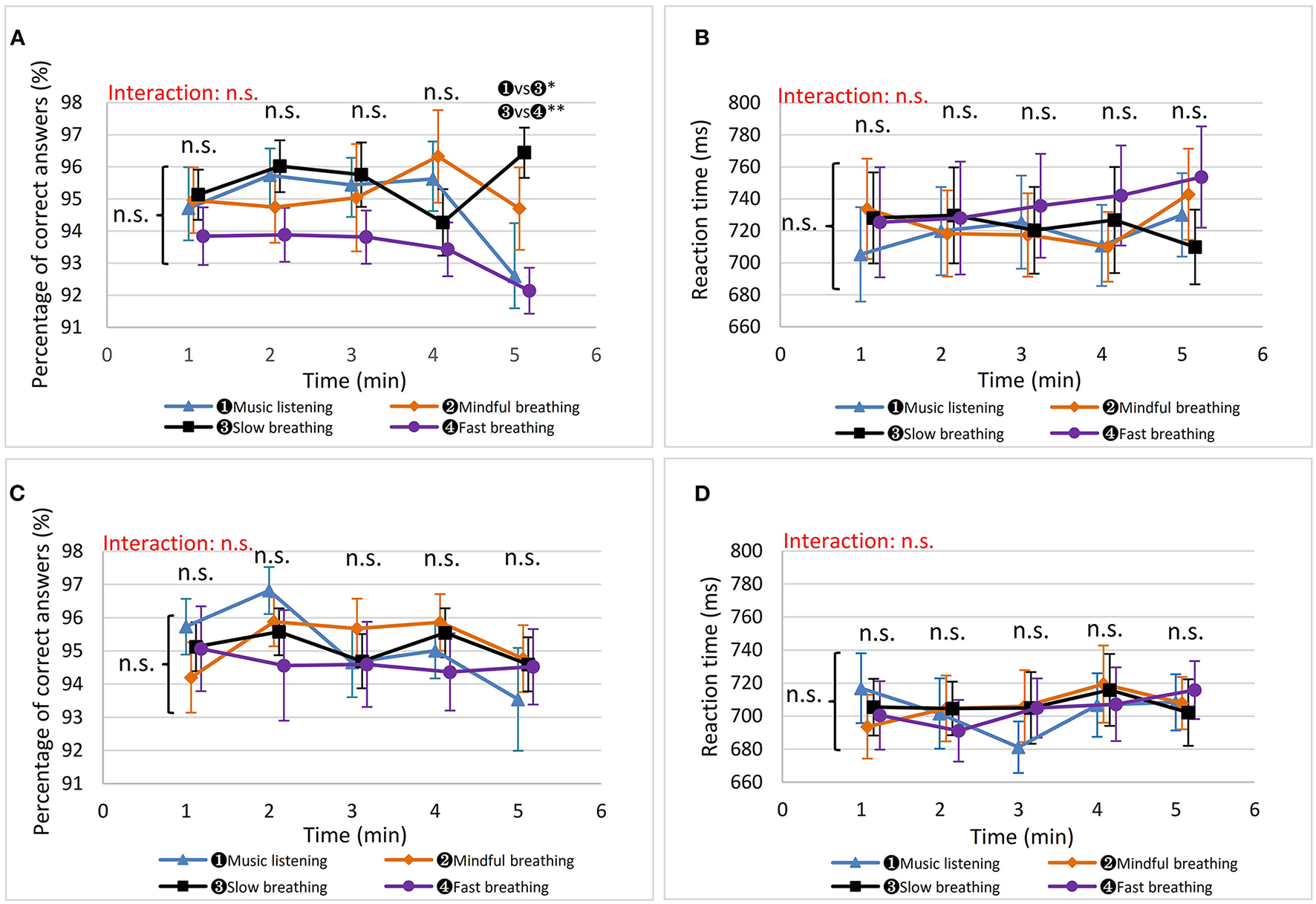 MUSIC, listening to music; MINDFUL, mindful breathing; SLOW, slow breathing; FAST, fast breathing.