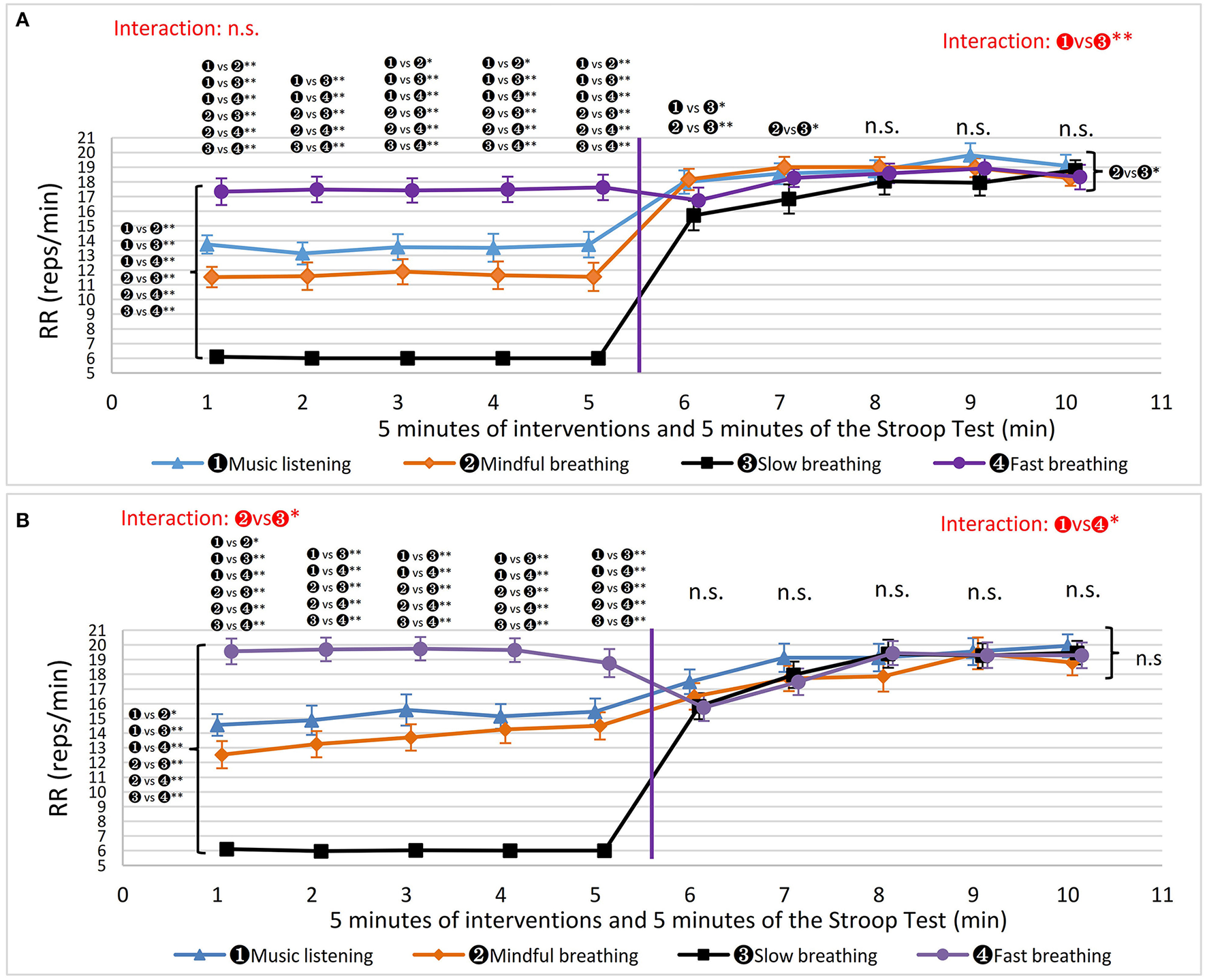 Mindful breathing, SLOW, FAST, and MUSIC were the four interventions. For MINDFUL, participants were required to be aware of the breath, without controlling the speed and depth, and without judgment of the quality (Burg and Michalak, 2011). The breath counting method was allowed for participants who felt it challenging to focus on their breath. SLOW was set at a speed of six breaths per minute, and obvious abdominal movement was required. An audio metronome was designed with a rising tone for inhalation and a falling tone for exhalation, setting the rate at 4 s for inhalation and 6 s for exhalation. Participants were instructed to gently expand their abdomen in addition to the natural expansion of the ribcage during inhaling, and relax their abdomen with attention on the area around the navel during exhaling. They were allowed to hold their breath naturally after exhalation to mimic natural breathing. The assessment of SLOW with obvious abdominal movement was conducted using two respiration belts. To determine the FAST rate, a respiration belt was used to measure RR during spontaneous breathing. FAST was then set at a speed that was 30% higher than an individual's regular breathing rate. During FAST, participants were also guided by an audio metronome. Regarding MUSIC, participants chose the relaxing music they preferred. Classical music (piano, Kiss the Rain; guzheng, Yun Shui Chan Xin) was provided, although participants could also listen to their own relaxing music.