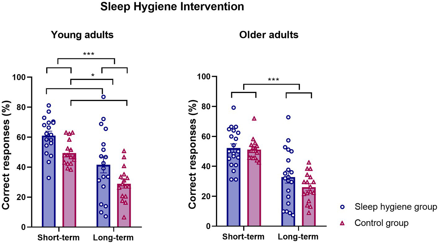 Figure 2. Sleep hygiene intervention effect on memory performance. Mean percentage of correct responses at short and long-term free recall after the sleep hygiene education ± SEM for young and older adults.