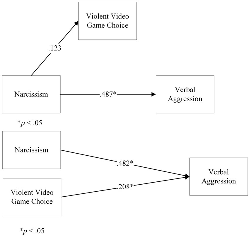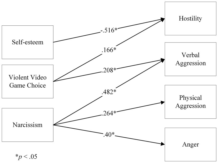 As such, the primary aim is to investigate whether the relationship between narcissism and aggression dimensions or self-esteem and aggression dimensions is enabled solely by violent video game choice when it is considered a mediator (Figures 1, 2).