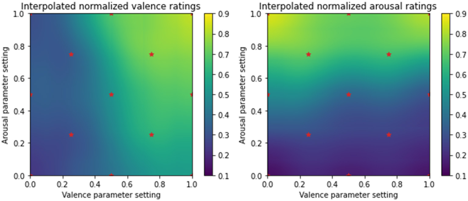 Average (interpolated) valence and arousal ratings as a function of the valence and arousal parameters. Vertical color bars represent the colors corresponding to different values of normalized average ratings over the range of 0.1–0.9.