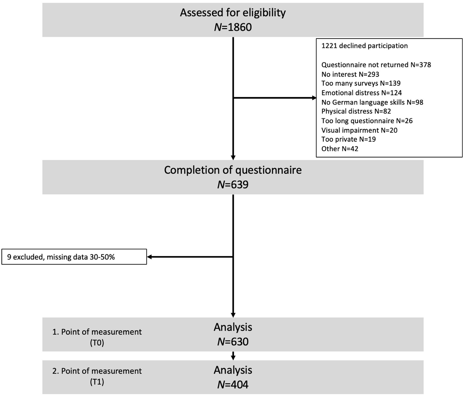 Descriptive statistics using frequencies for categorical data or mean values and standard deviation (SD) for interval-level data were computed to describe the sample. N = 9 cases had to be excluded from the analysis because of missing values > 30% (see Figure 1). For the confirmatory factor analysis, missing values were handled by maximum likelihood estimation. All other analyses were performed using complete cases only. We performed the validation and item reduction with data from the first point of measurement and the reliability and responsiveness to change analysis with data from both points of measurement.