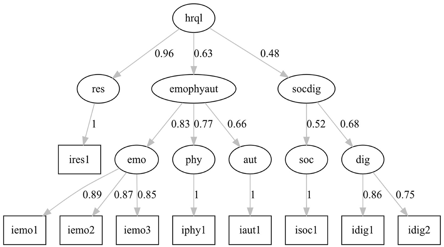 On the basis of the previous qualitative study (Schrage et al., 2022), hierarchical confirmatory factor analyses (Greenhalgh et al., 2004) were conducted to test the factor structure of the instrument. The sample size is sufficient for this analysis (Mundfrom et al., 2005). Because of the skewed distribution in two items, the covariance matrix of the items was analyzed using robust maximum likelihood estimation. Parameters were standardized using the completely standardized solution where the variance of the factor (HrQoL) and the latent and observed variables are standardized. For the evaluation of the global model fit, we examined model fit indices with a cutoff of 0.95 for the Tucker–Lewis index (Mackler et al., 2017) and the Bentler comparative fit index (CFI) and a cutoff of below 0.08 for the root mean square error of approximation (RMSEA) and the standardized root mean square residual (SRMR) according to Hu and Bentler, in addition to the Akaike Information Criterion (AIC; Hu and Bentler, 1999). Two models were fitted: (1) a hierarchical model of the HELP with a general latent factor of HrQoL and with second-level latent factors of the six HELP dimensions resulting from previous qualitative analysis (Emotional Health, Physical Ailment, Autonomy, Social Functionality, Dignity, and Resources) and (2) an exploratory modified hierarchical model. This second model was fitted to further understand the comprehensive concept of HrQoL. We intended to examine with an additional exploratory model by adding a second level of latent factors, whether the model fit and factor loadings could improve and therefore have a better fit of the model. CFAs were conducted using the packages lavaan (Rosseel, 2012) and lavaanPlot (Alex, 2021) of the R Software (version 4.1.2) (The R Foundation, 2022). All further analyses were conducted using IBM SPSS Software (version 27).