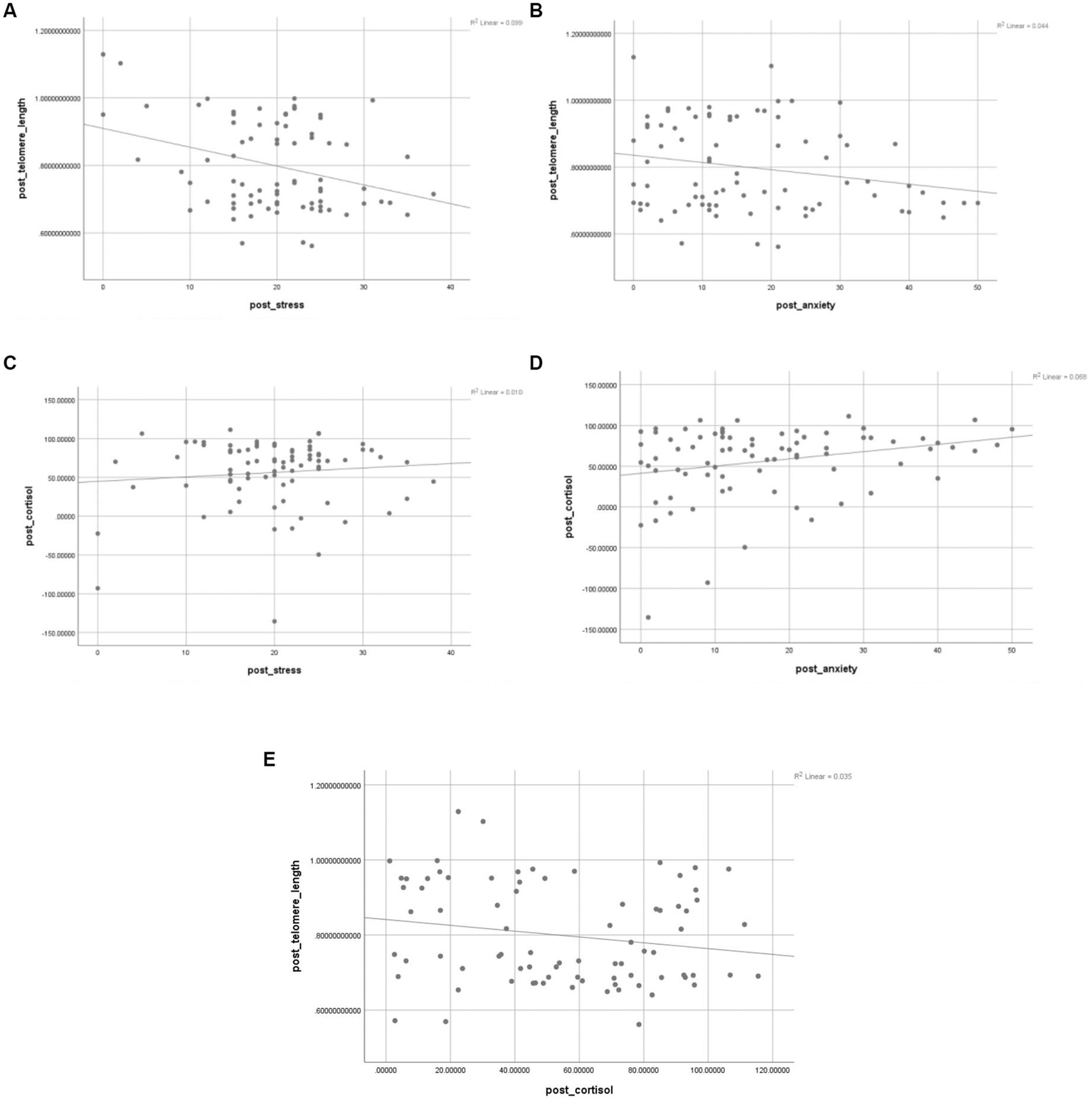 The correlation between telomere length and psychological variables was in the expected direction. Post-intervention, a negative correlation between perceived stress, anxiety and mindfulness was observed (Table 3); although this correlation was significant only in the case of perceived stress.