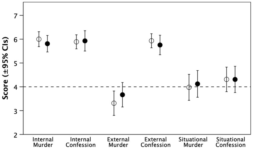 Mean (±95% CIs) for the tasks used to test hypothesis H1: transportation (immersion) whilst watching the video. Filled symbols: ‘Fiction’ condition; unfilled symbols: ‘Real’ condition. Dashed line demarcates the midpoint in the scale used. * indicates murderer.