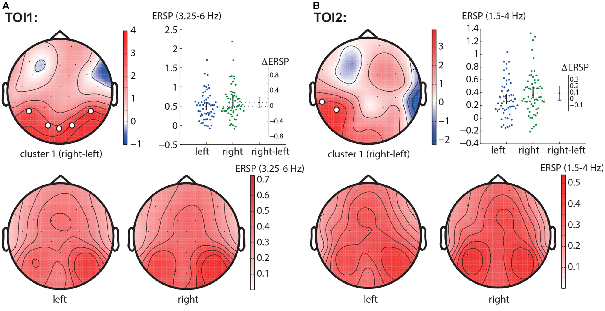 Right-left contrast. The subfigures illustrate different clusters as the result of NWP comparison between the right- and left-oriented stimuli: the first cluster in the TOI1 (A) and the first cluster in TOI2 (B). Topograms reflect the values of F-statistic, and the subjects-average ERSP in the compared conditions. Scatter-plot shows the NWP averaged across the EEG sensors belonging to this cluster. Difference between the conditions is shown with the 95% confidence interval.
