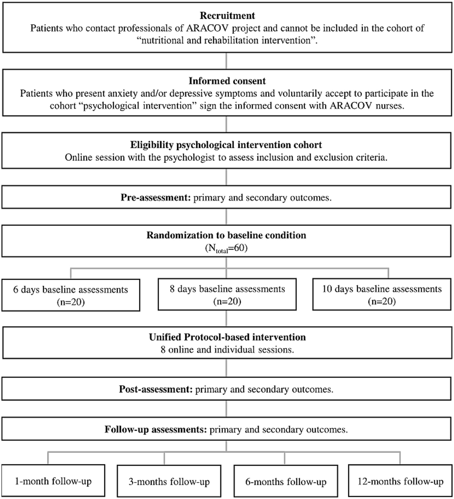 This is a secondary study derived from a bigger project called “ARACOV.” Participants in our study will be composed of a subsample of the ARACOV multicentre project. The ARACOV project aims to characterize patients with long COVID-19 and assess the impact of a nutritional and rehabilitation intervention for the improvement of quality of life in a cohort of patients with post COVID-19 condition. According to the procedures of this project, participants with long COVID-19 that are interested in participating in the project ARACOV will contact recruiting nurses. In this step nurses will conduct an extensive interview to explore if patients are able to participate in this primary ARACOV project. Patients who are not included in this specialized nutritional intervention and rehabilitative treatment due to exclusion criteria (see supplementary material C) would be offered the possibility of participating in the secondary study that aims to implement a transdiagnostic psychological intervention. Eligibility criteria to participate in this transdiagnostic psychological intervention include: being long COVID-19 adult patients (over 18 years old), presenting emotional disorders or symptoms and residing in the autonomous community of Aragón (see Table 1).