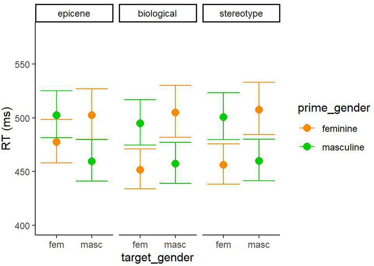 The results revealed a gender-congruency effect for all prime types, including epicene nouns. Given that the grammatical gender assignment of epicene nouns is arbitrary and does not correlate with the biological sex of animate entities, the results indicate that the gender-congruency effect is driven by the activation of the grammatical gender feature even when processing bare nouns that are not conceptually related to gender.4 Furthermore, we found similar effect sizes of the gender-congruency effect for biological (neutral) and stereotypical primes, indicating that the extra information about the biological gender coming from the biological gender (semantic) and from the associated stereotype (connotational) did not increase the gender-congruency effect. Altogether, it seems that the nature of the gender-congruency effect may not be exclusively driven by the activation of conceptual information related to biological gender, but at least in part may be driven by the activation of the gender information at the lexical-grammatical level, that is transferred to the semantic level especially for nouns mapping gender conceptually (i.e., the neutral and stereotypical role-nouns).