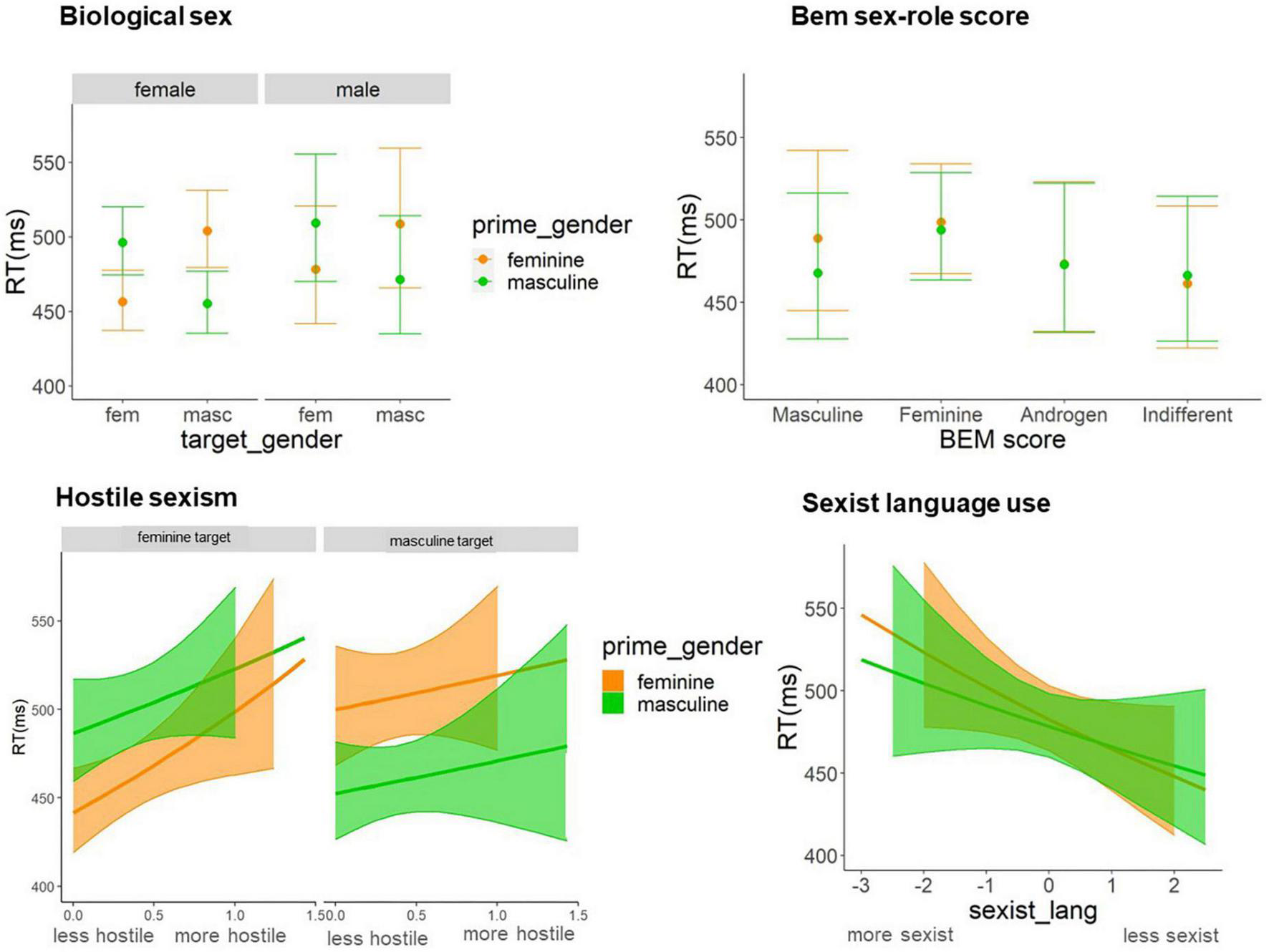 At the left side, model-based predictions of the gender-congruency effect modulated by the biological sex of the participants (female, male) and the scores in hostile sexism (less hostile, more hostile). At the right side, model-based predictions of the interaction between the prime gender and the Bem sex-role score (androgen, feminine, non-differentiated, masculine) and the sexist language use (more sexist, less sexist).