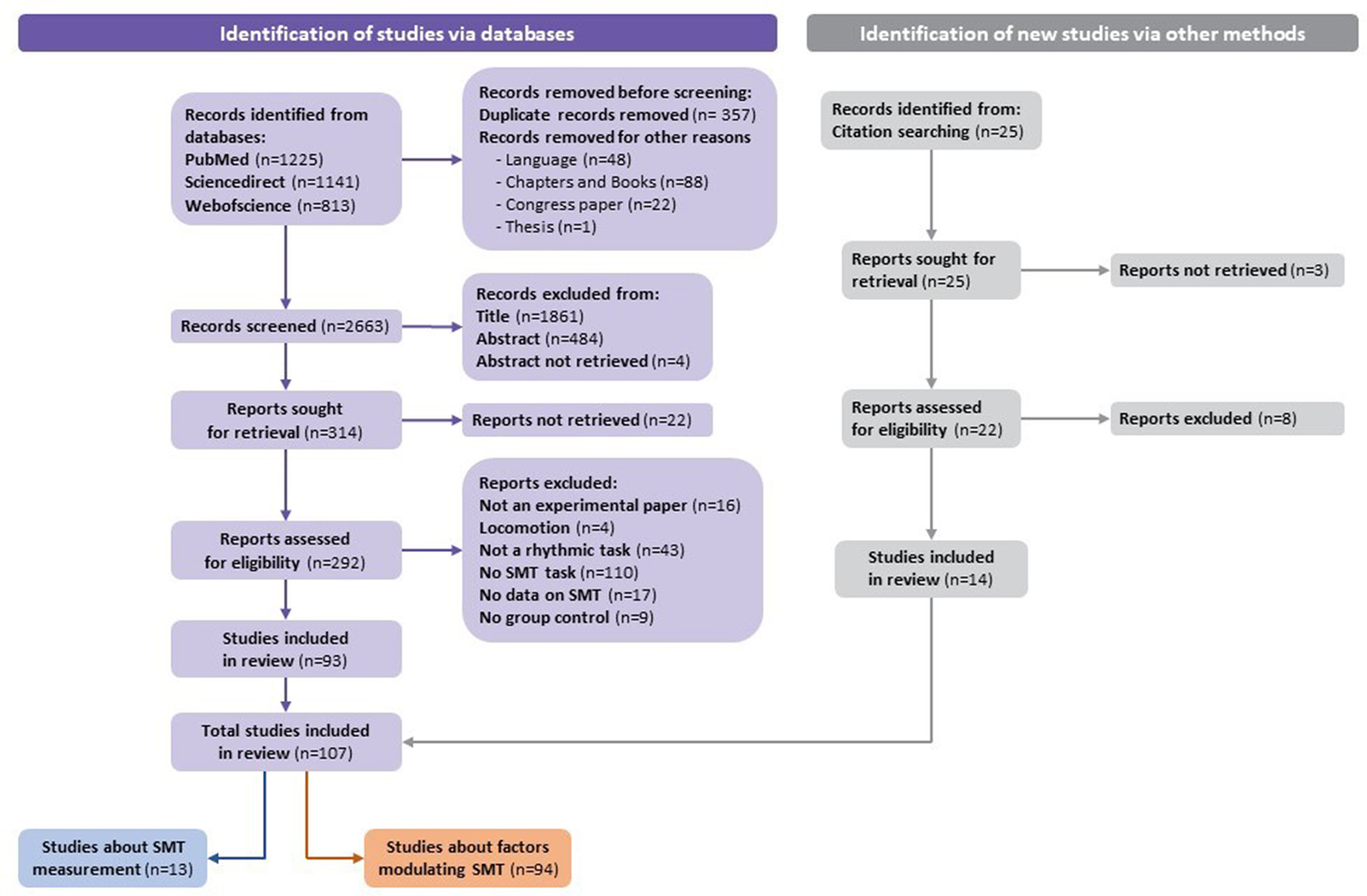 We only selected articles and reviews before screening by excluding congress papers, chapters, books, and theses. Reviews identified in databases were just used to find missing original articles about SMT, and they have not been included in the systematic review (reviews not included: Provasi et al., 2014a; Poeppel and Assaneo, 2020; Van Wassenhove, 2022).