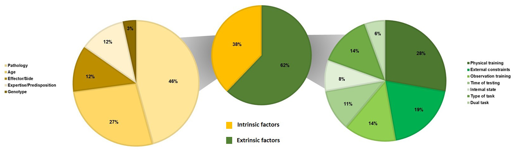 In total, 13 studies provide a SMT value or a range of SMT values in healthy adults (Table 3). Our results reveal that the range of SMT values is from 333 to 3,160 ms. Notably, 94 studies measure the effect of the factor(s) on the SMT values (Table 4). We classified studies according to the type of factors modulating the SMT values: intrinsic factors, in relation to personal characteristics, and extrinsic factors, in relation to environmental characteristics. Concerning intrinsic factors, we have found studies investigating the effects of a pathology (N = 27), age (N = 16), the effector or the side (N = 7), the expertise or a predisposition (N = 7), and the genotype (N = 2). Concerning extrinsic factors, we have found studies investigating the effects of physical training (N = 10), external constraints (N = 7), observation training (N = 5), the time of testing (N = 4), the internal state (N = 3), the type of task (N = 5), and a dual task (N = 2).
