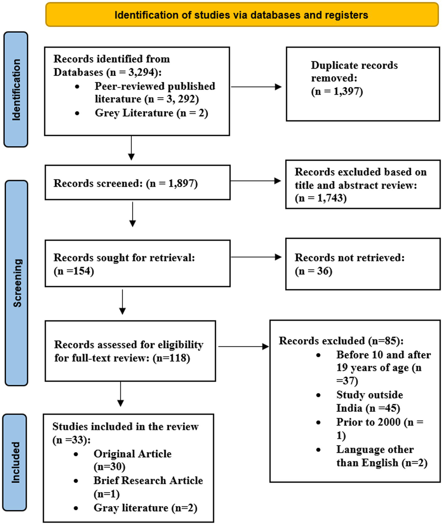 Figure 1 represents the PRISMA flow chart explaining the literature review process. In total, 3,294 searches were located from different electronic databases, including grey literature like websites of agencies, academic institutions, and technical bodies. Following the removal of 1,397 duplicate records, a total of 1,897 records were reviewed, with 1,743 records being excluded due to title and abstract screening. Among the 154 retrievals records, 118 full-text records were suitable for analysis, and 33 of them were included in the research based on inclusion and exclusion criteria (Figure 1).