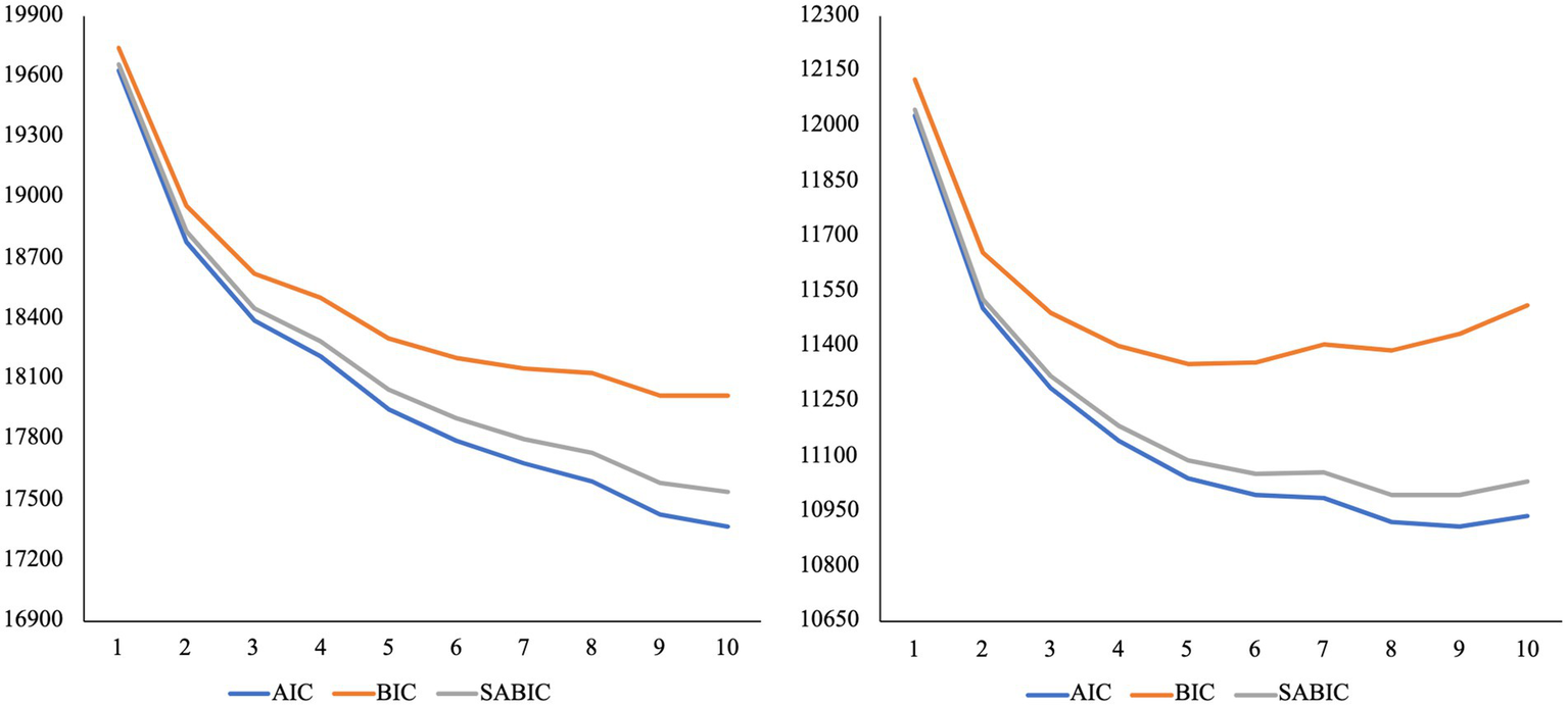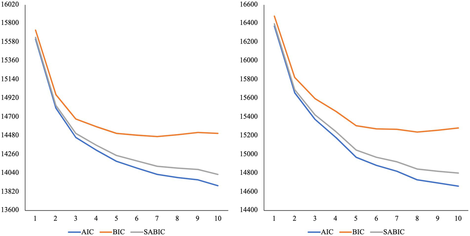 To address aim one, we conducted a latent profile analysis using Mplus (V 8.6) (Muthén and Muthén, 1998–2021) to identify multivariate profiles of parents’ emotion socialization. We estimated models with 1–10 profiles. Thirteen indicators were included in the latent profile analysis: the standardized mean scores of five subscales for parents’ beliefs about children’s emotions, one total score of parent emotion dysregulation, and seven subscales of emotion-related parenting practices. A small number of participants (n = 87) did not provide response data for all three measures included in the latent profile analysis. We conducted Little’s MCAR test via Stata to examine whether their response data were missing completely at random (MCAR). Results suggested that their data were not MCAR (χ2 [65] =104.03, p < 0.01, N = 956). We excluded their data, as they may have biased our results. Missing data, i.e., item-level missing data, were handled with Full Information Maximum Likelihood. A robust maximum likelihood estimator (i.e., MLR) was used in all models to account for clustering by household (i.e., where two parents from the same household participated in the study, n = 111). Our sample of N = 869 meets Nylund-Gibson and Choi (2018) recommendation of ≥300 observations for a latent profile analysis.
